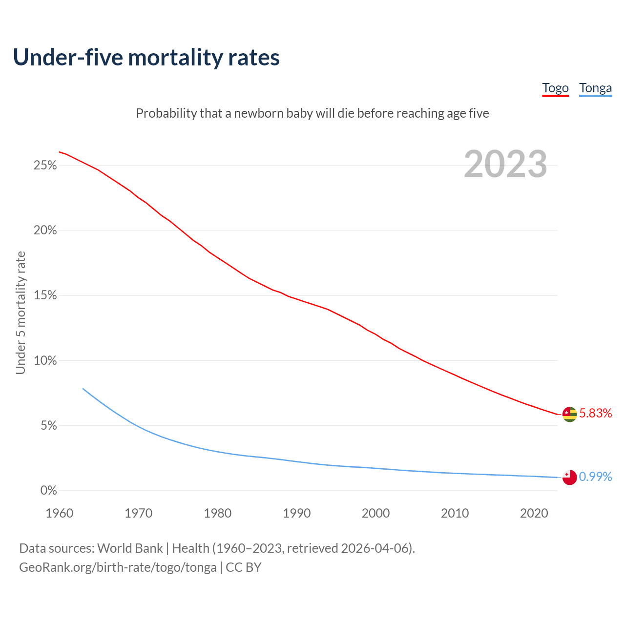 The chance that a newborn baby will die before reaching age five is 5.83% in Togo and 0.99% in Tonga. Above is a chart with historical data on under-five mortality rates.
