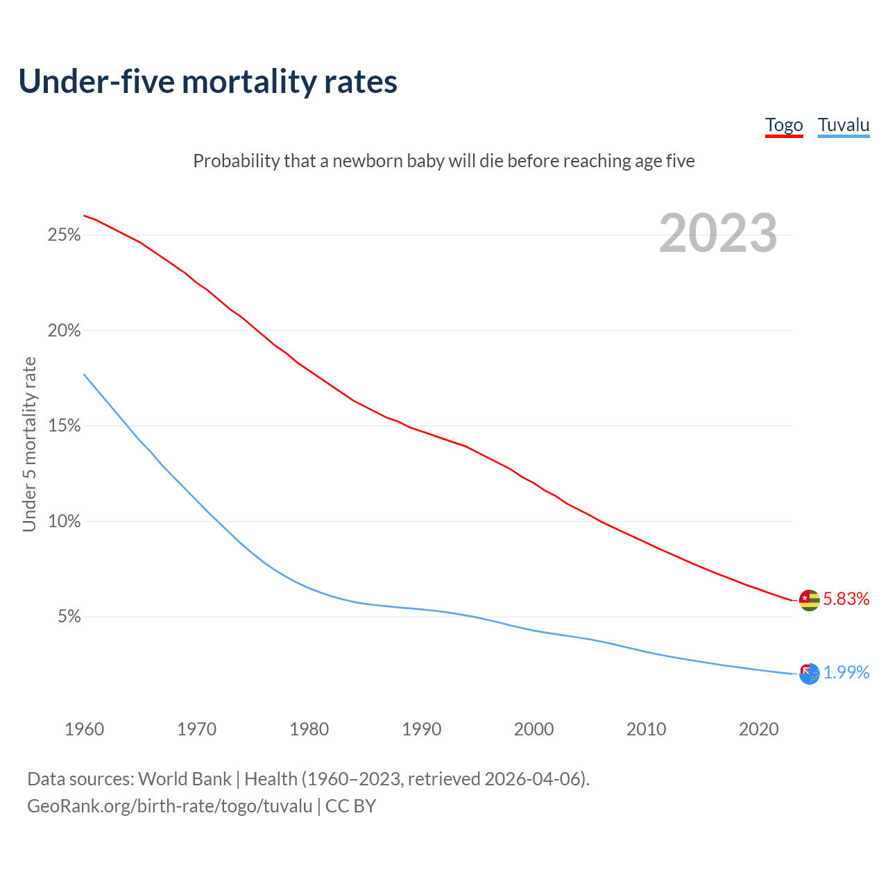 The chance that a newborn baby will die before reaching age five is 5.83% in Togo and 1.99% in Tuvalu. Above is a chart with historical data on under-five mortality rates.