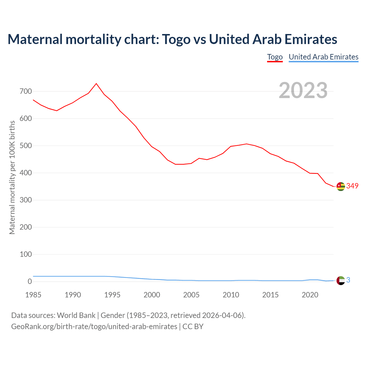 The maternal mortality rate, which is the probability of dying during childbirth or within 42 days of pregnancy termination, is 349 deaths per 100,000 live births in Togo, compared to 3 deaths in the United Arab Emirates.