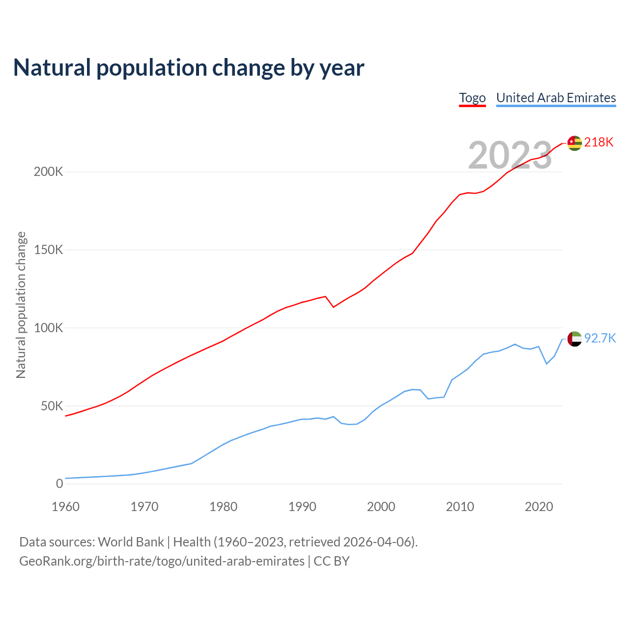 Togo has an annual birth rate of 31.1 births per 1,000 people, compared to 9.77 for the United Arab Emirates. The average number of children a woman is expected to have during her lifetime — the fertility rate, is 4.19 in Togo and 1.2 in the United Arab Emirates — 71.4% difference.