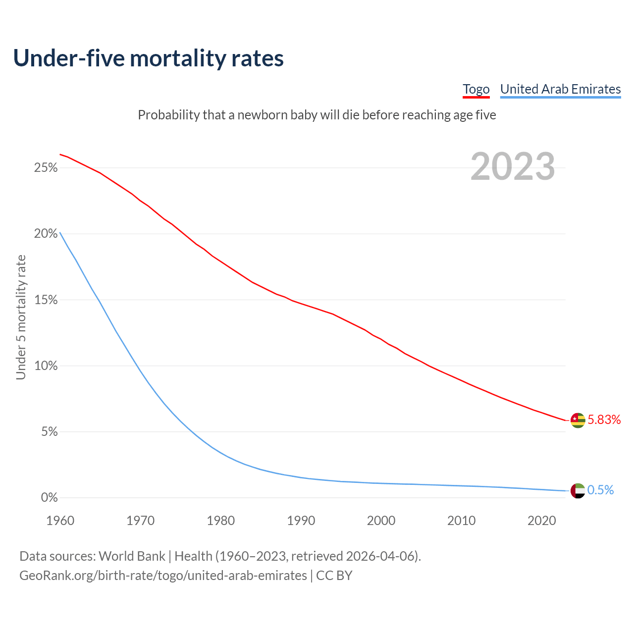 The chance that a newborn baby will die before reaching age five is 5.83% in Togo and 0.5% in the United Arab Emirates. Above is a chart with historical data on under-five mortality rates.