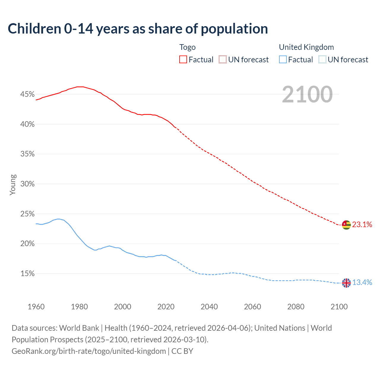 Togo has an annual birth rate of 31.1 births per 1,000 people, compared to 10 for the United Kingdom. The average number of children a woman is expected to have during her lifetime — the fertility rate, is 4.19 in Togo and 1.56 in the United Kingdom — 62.8% difference.