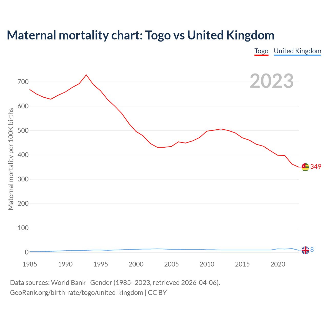 The maternal mortality rate, which is the probability of dying during childbirth or within 42 days of pregnancy termination, is 349 deaths per 100,000 live births in Togo, compared to 8 deaths in the United Kingdom.
