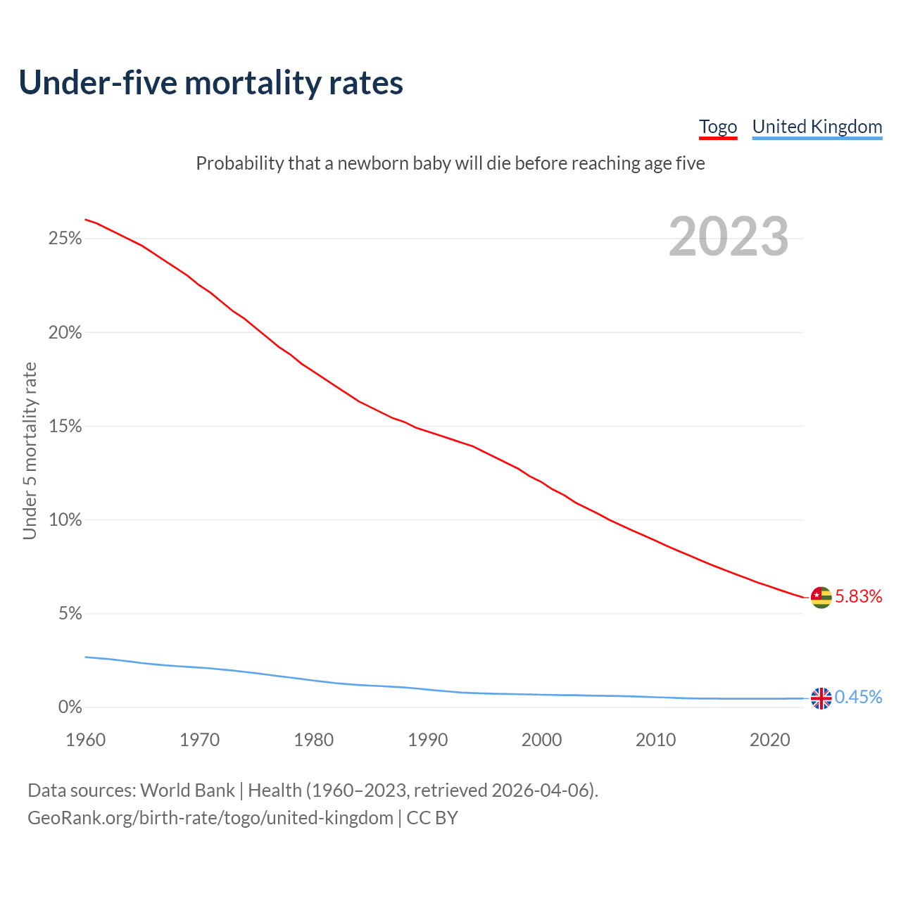 The chance that a newborn baby will die before reaching age five is 5.83% in Togo and 0.45% in the United Kingdom. Above is a chart with historical data on under-five mortality rates.