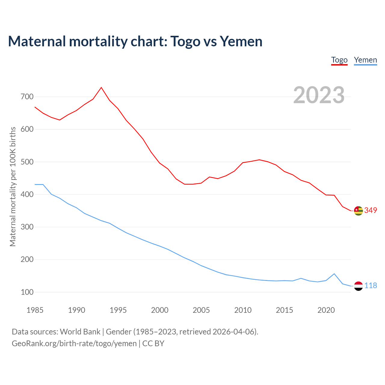 The maternal mortality rate, which is the probability of dying during childbirth or within 42 days of pregnancy termination, is 349 deaths per 100,000 live births in Togo, compared to 118 deaths in Yemen.