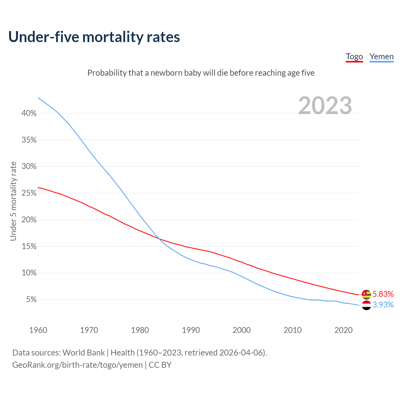 The chance that a newborn baby will die before reaching age five is 5.83% in Togo and 3.93% in Yemen. Above is a chart with historical data on under-five mortality rates.
