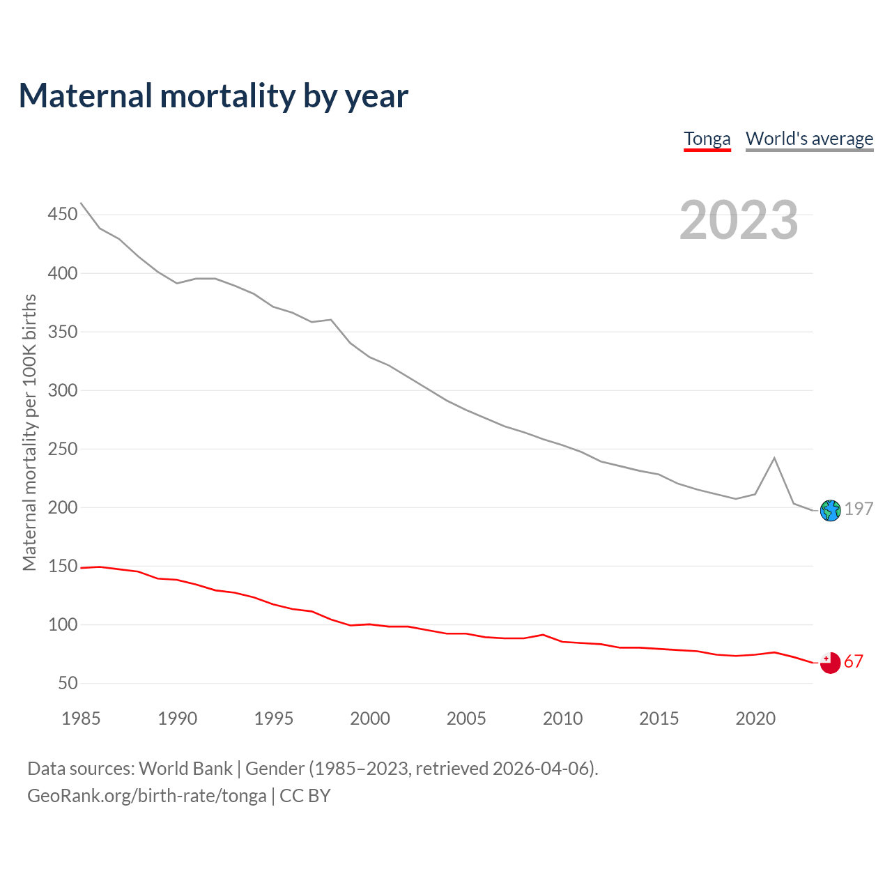 The maternal mortality rate in Tonga was 67 deaths per 100,000 live births in 2023 — a 0.07% chance of dying during childbirth or within 42 days of pregnancy termination. This is a 33% decrease compared to the year 2000.