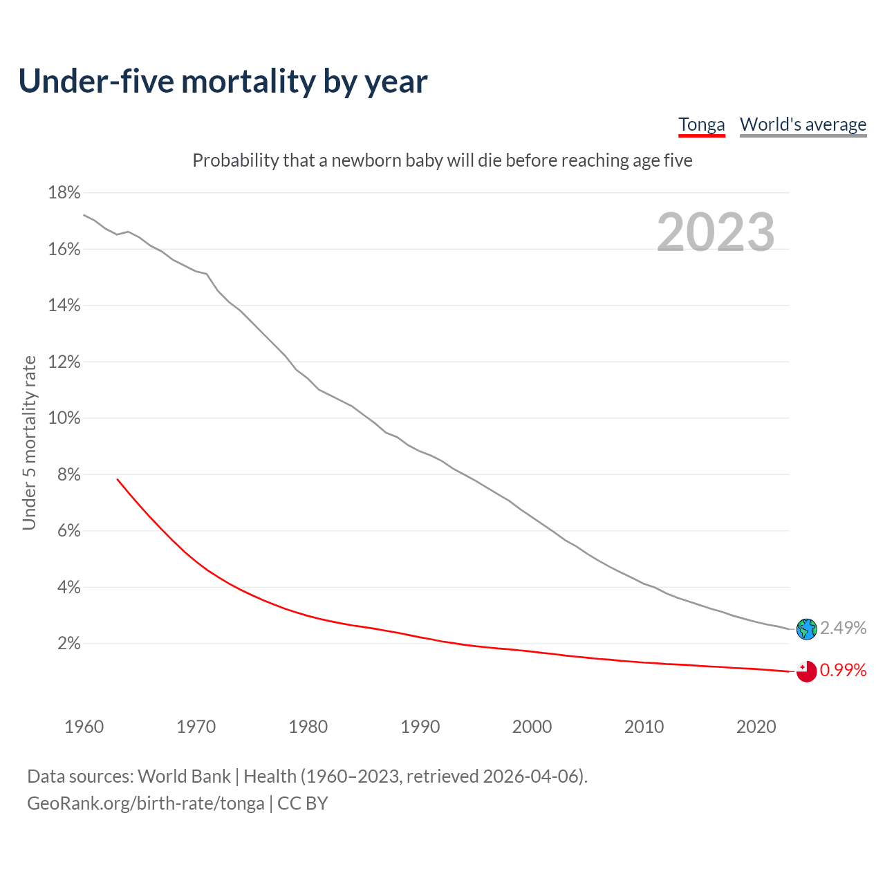 The under-5 mortality rate in Tonga was 9.9 deaths per 1,000 live births in 2023 — a 0.99% chance that a newborn baby will die before reaching age five. This is down from 17 deaths per 1,000 live births in 2000.