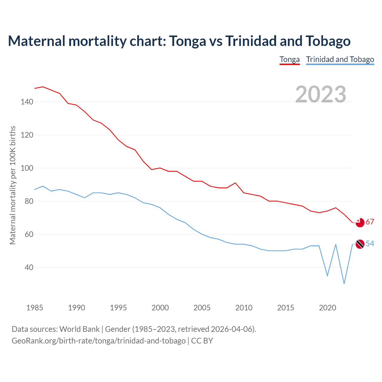 The maternal mortality rate, which is the probability of dying during childbirth or within 42 days of pregnancy termination, is 67 deaths per 100,000 live births in Tonga, compared to 54 deaths in Trinidad and Tobago.