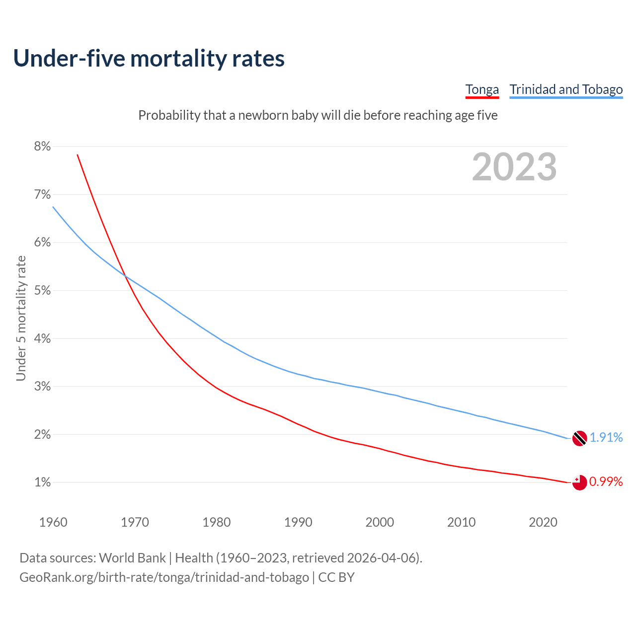 The chance that a newborn baby will die before reaching age five is 0.99% in Tonga and 1.91% in Trinidad and Tobago. Above is a chart with historical data on under-five mortality rates.