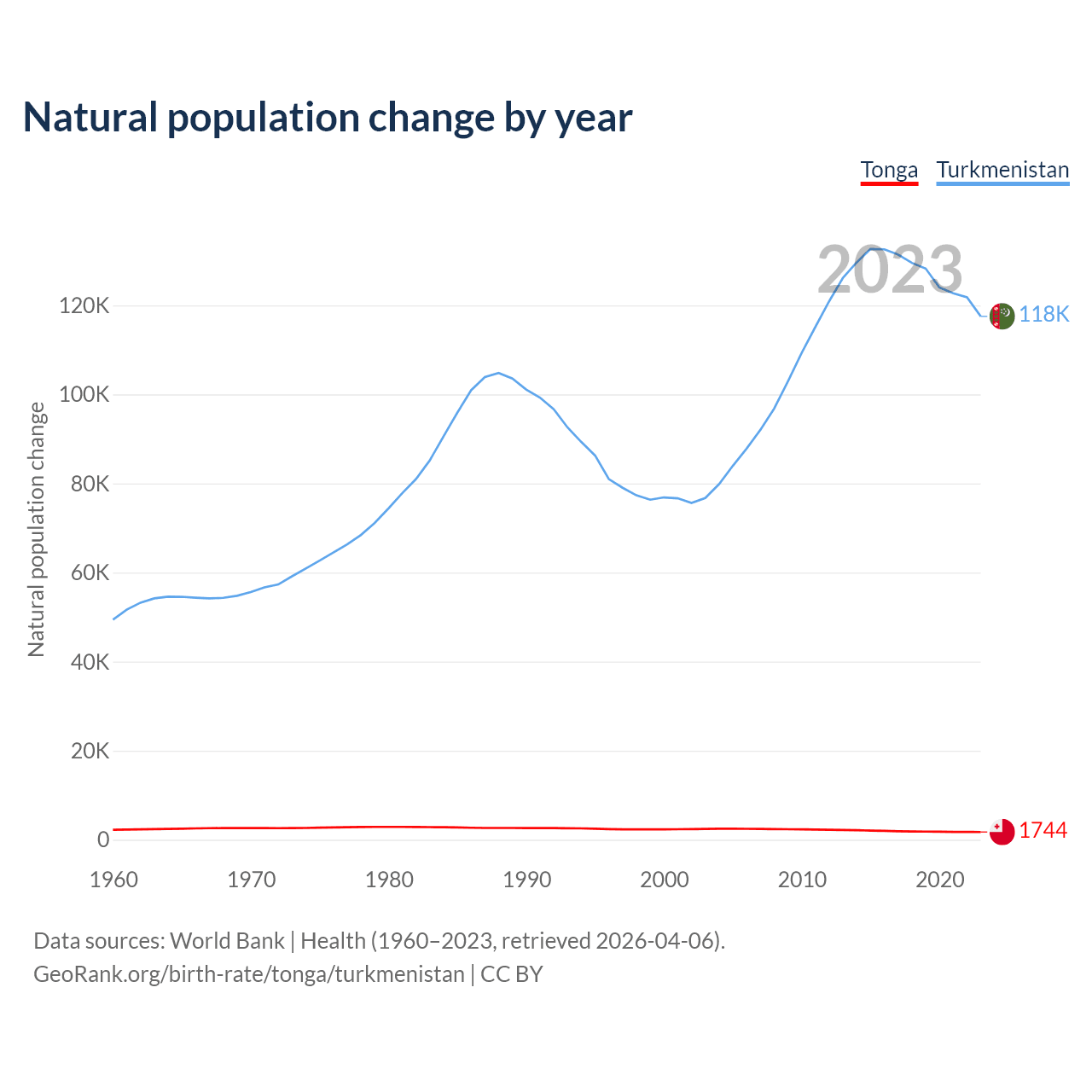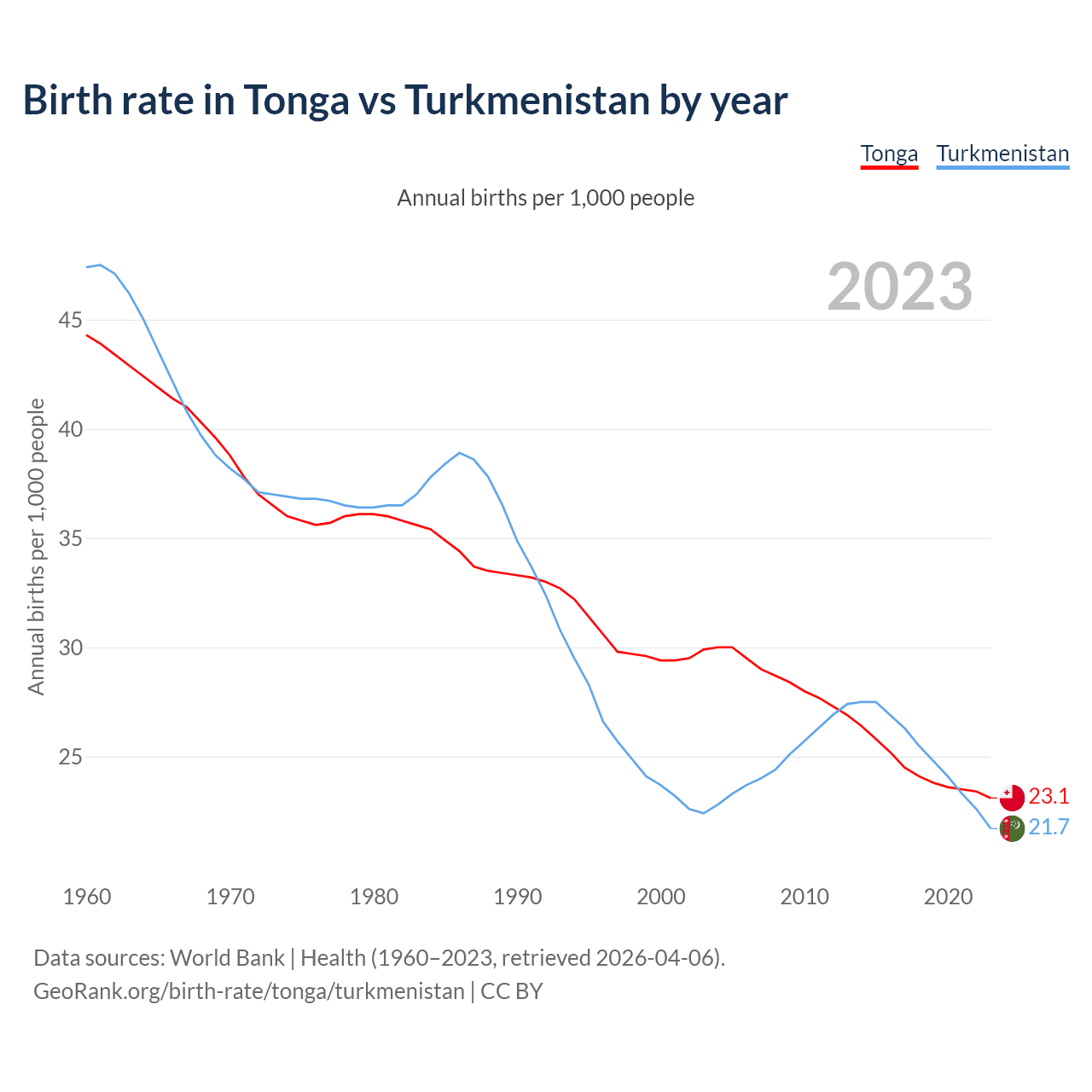 Tonga has an annual birth rate of 23.1 births per 1,000 people, compared to 21.7 for Turkmenistan. The average number of children a woman is expected to have during her lifetime — the fertility rate, is 3.13 in Tonga and 2.69 in Turkmenistan — 14% difference.