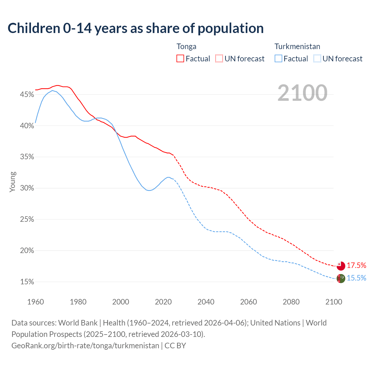 According to the latest available data on birth rates, the fertility rate in Tonga was 3.13 children per woman in 2023, compared to 2.69 in Turkmenistan in 2023. The replacement level is considered to be 2.1 children per woman.