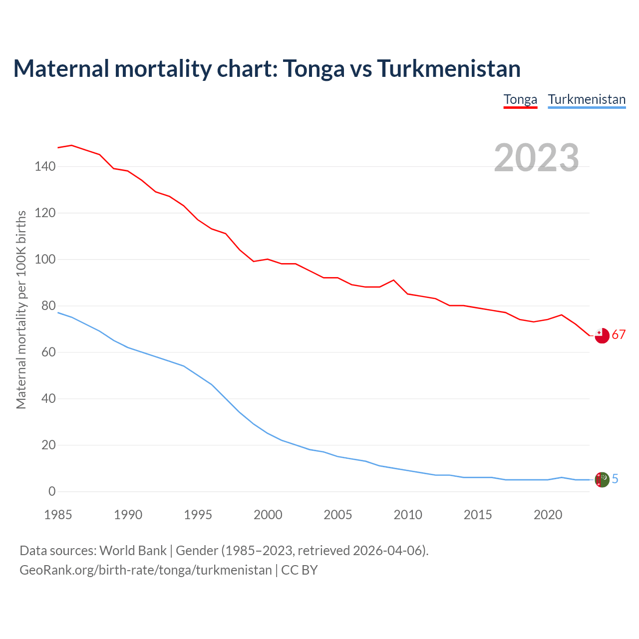 The maternal mortality rate, which is the probability of dying during childbirth or within 42 days of pregnancy termination, is 67 deaths per 100,000 live births in Tonga, compared to 5 deaths in Turkmenistan.