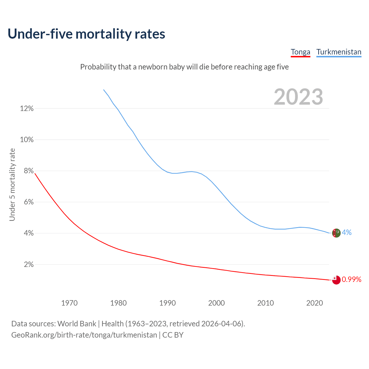 The chance that a newborn baby will die before reaching age five is 0.99% in Tonga and 4% in Turkmenistan. Above is a chart with historical data on under-five mortality rates.