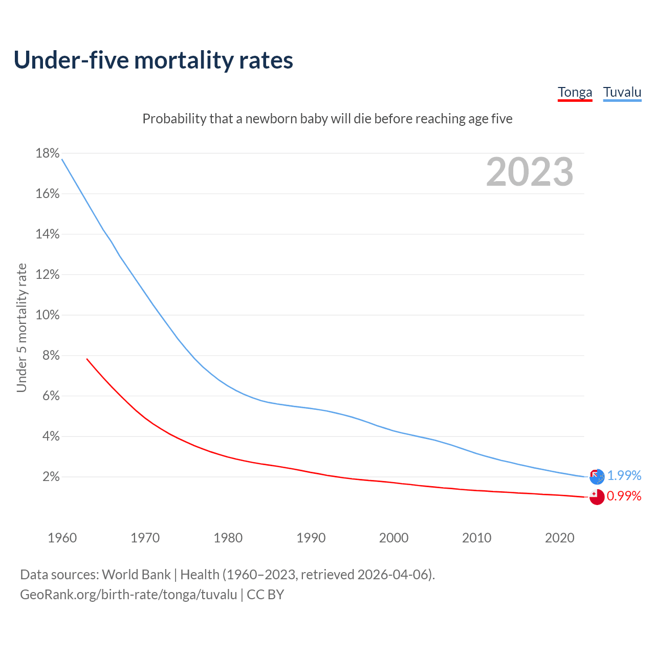 The chance that a newborn baby will die before reaching age five is 0.99% in Tonga and 1.99% in Tuvalu. Above is a chart with historical data on under-five mortality rates.