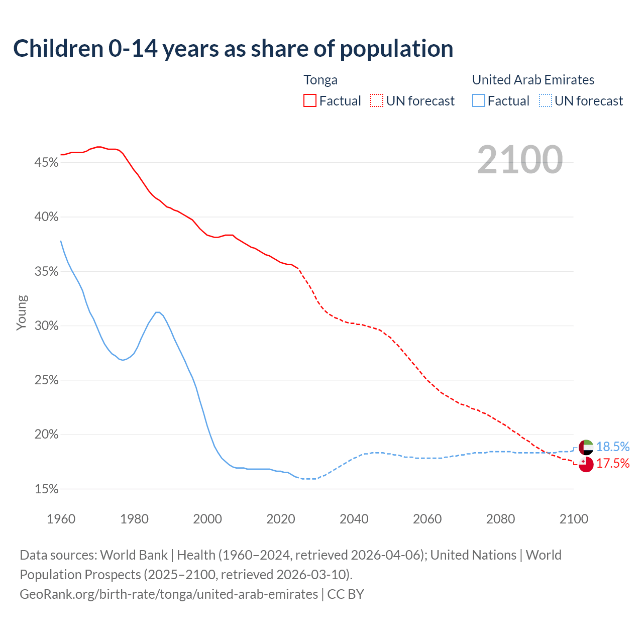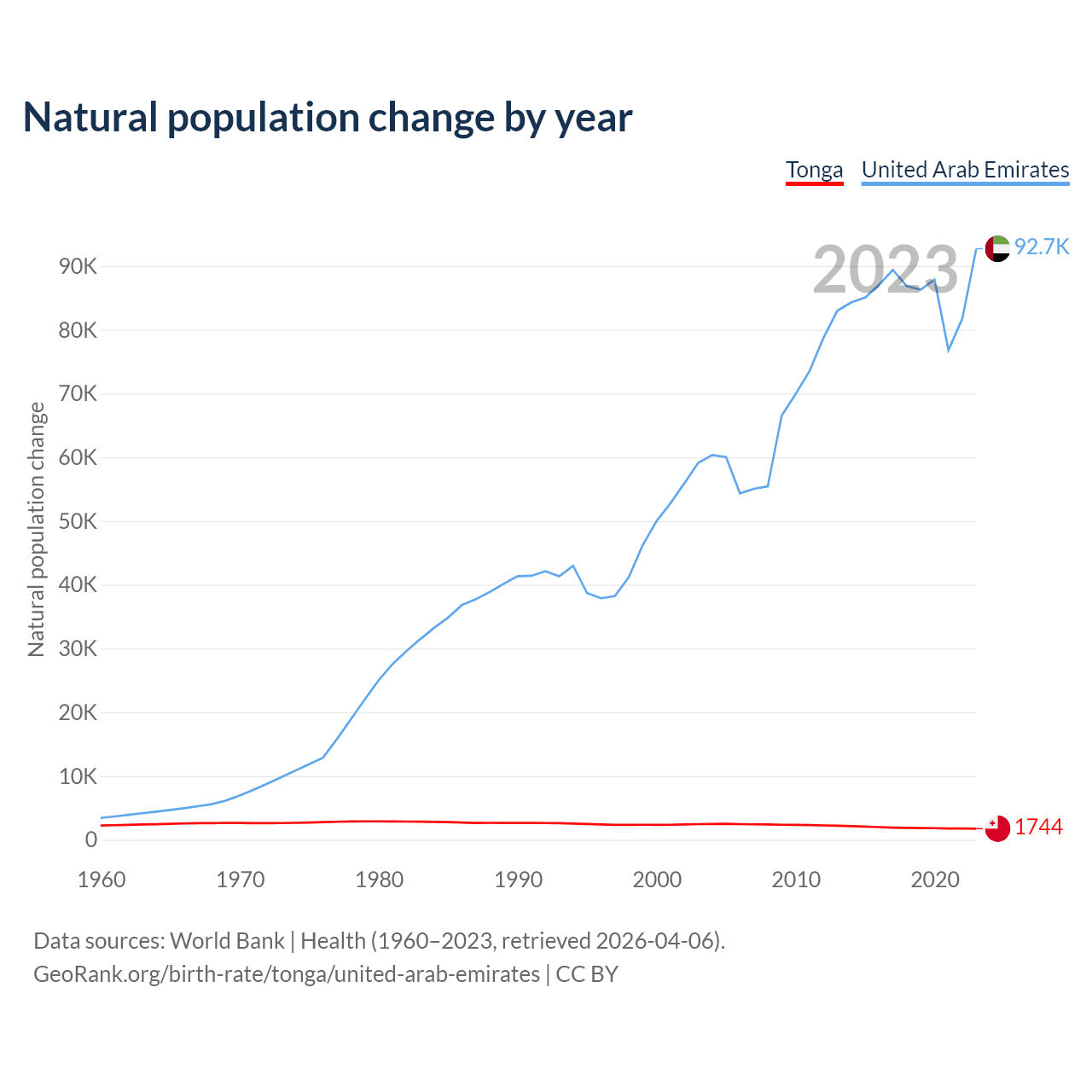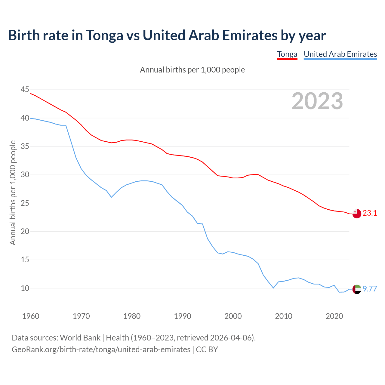 Tonga has an annual birth rate of 23.1 births per 1,000 people, compared to 9.77 for the United Arab Emirates. The average number of children a woman is expected to have during her lifetime — the fertility rate, is 3.13 in Tonga and 1.2 in the United Arab Emirates — 61.6% difference.