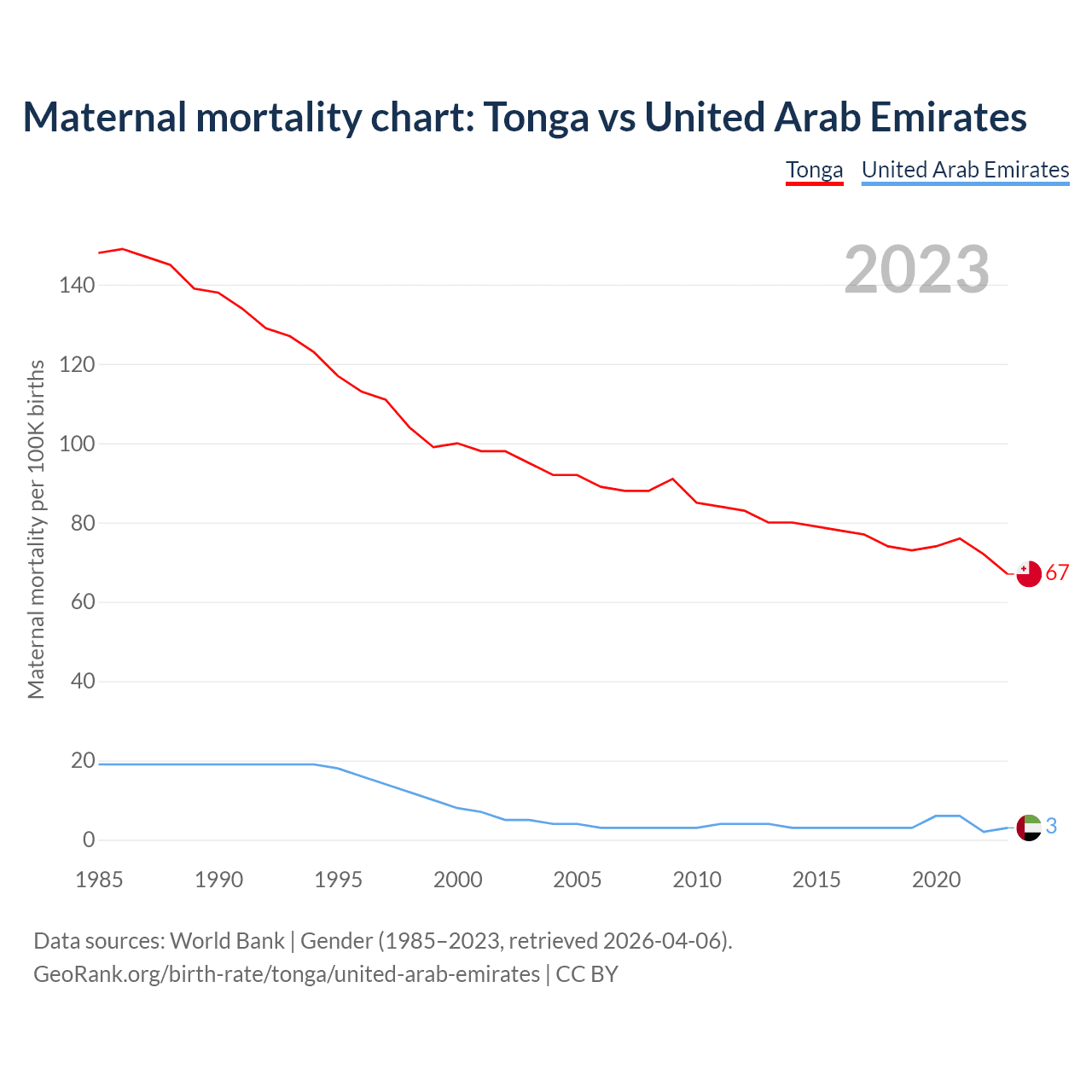 The maternal mortality rate, which is the probability of dying during childbirth or within 42 days of pregnancy termination, is 67 deaths per 100,000 live births in Tonga, compared to 3 deaths in the United Arab Emirates.