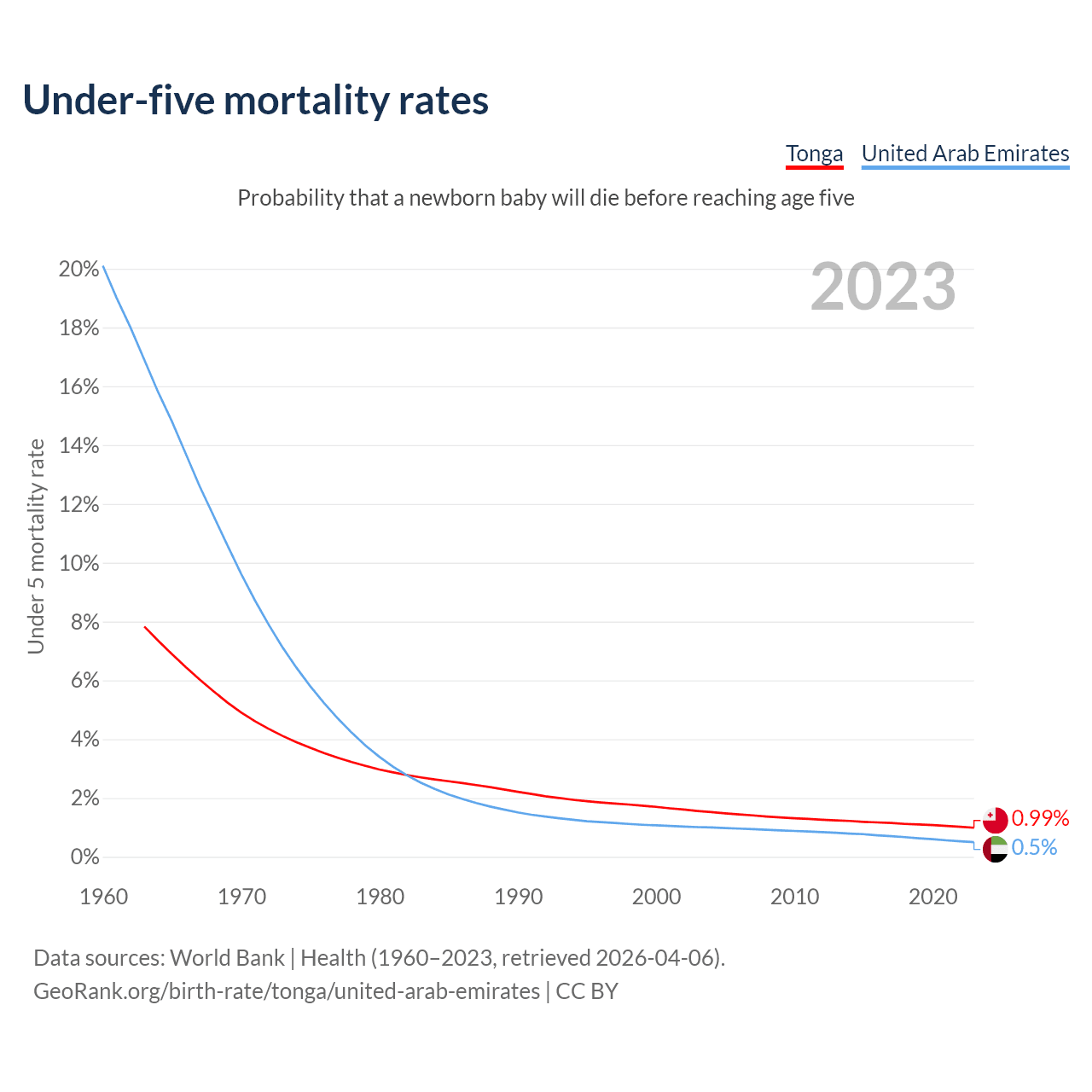 The chance that a newborn baby will die before reaching age five is 0.99% in Tonga and 0.5% in the United Arab Emirates. Above is a chart with historical data on under-five mortality rates.