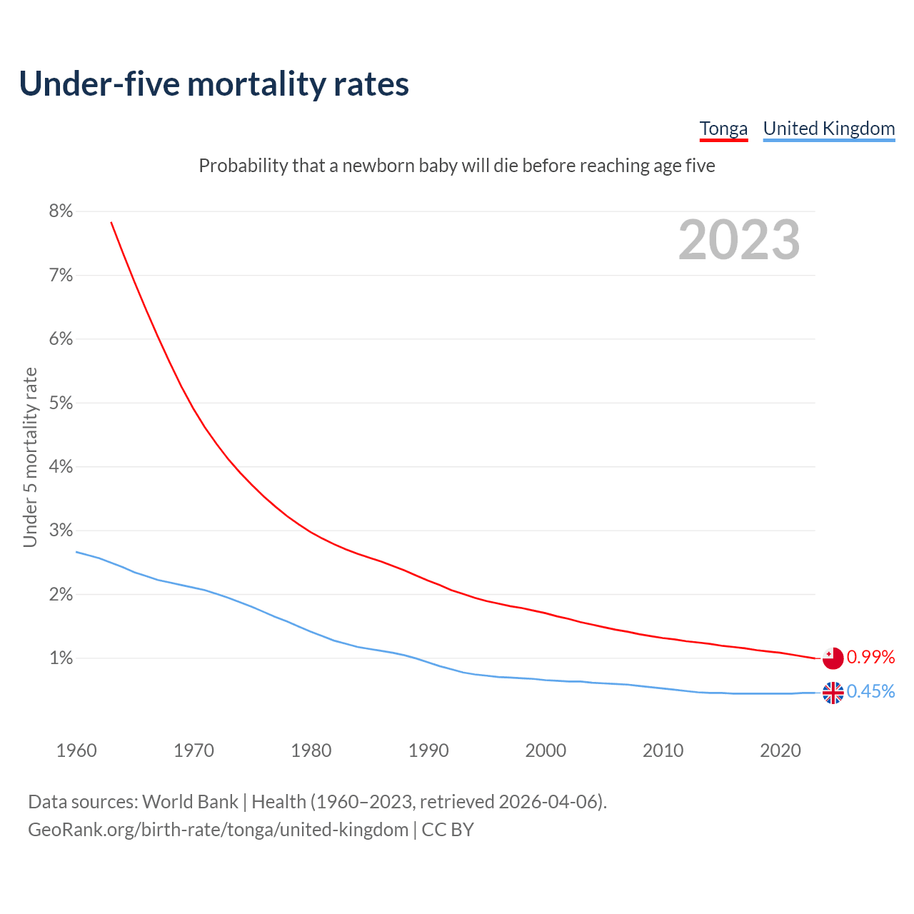 The chance that a newborn baby will die before reaching age five is 0.99% in Tonga and 0.45% in the United Kingdom. Above is a chart with historical data on under-five mortality rates.