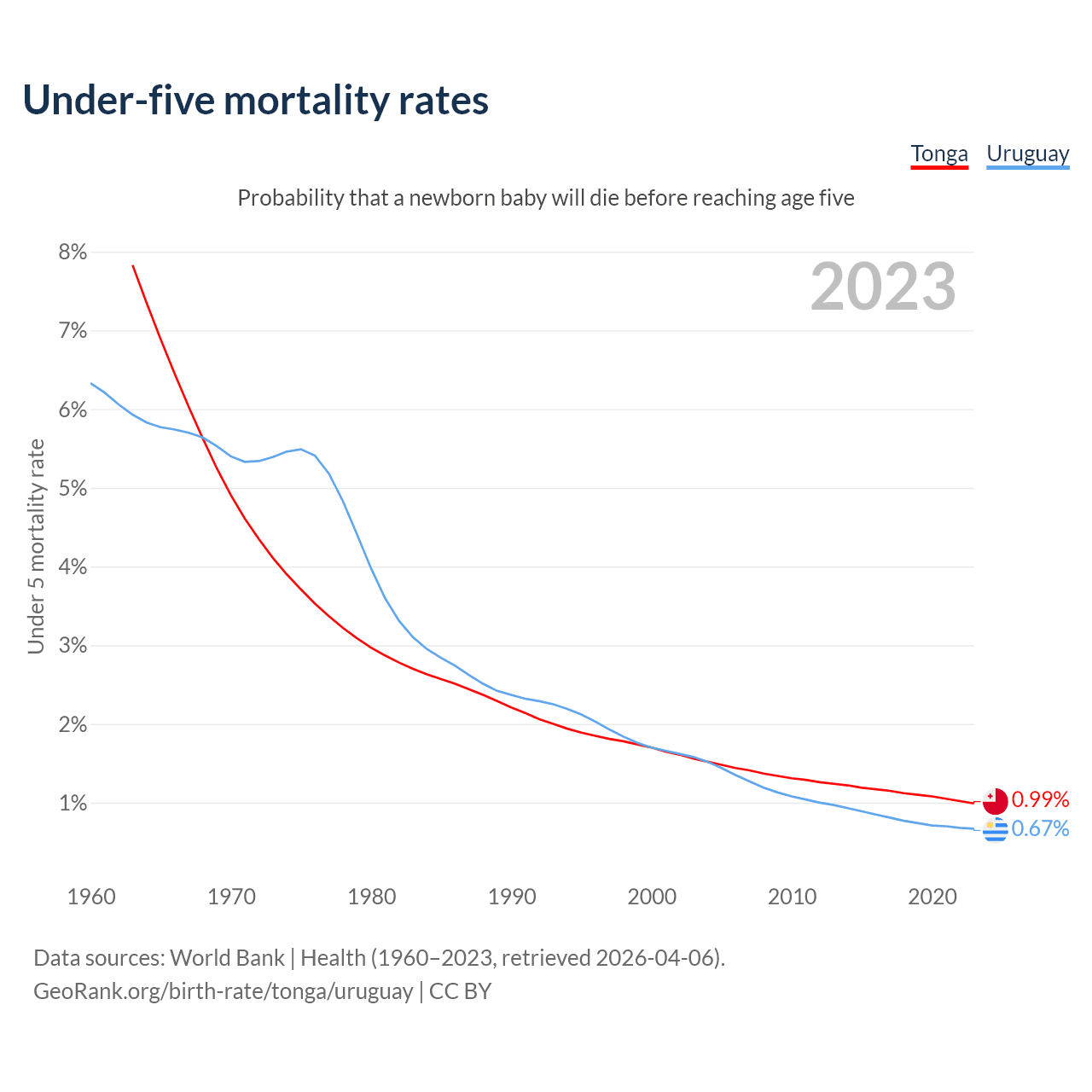The chance that a newborn baby will die before reaching age five is 0.99% in Tonga and 0.67% in Uruguay. Above is a chart with historical data on under-five mortality rates.