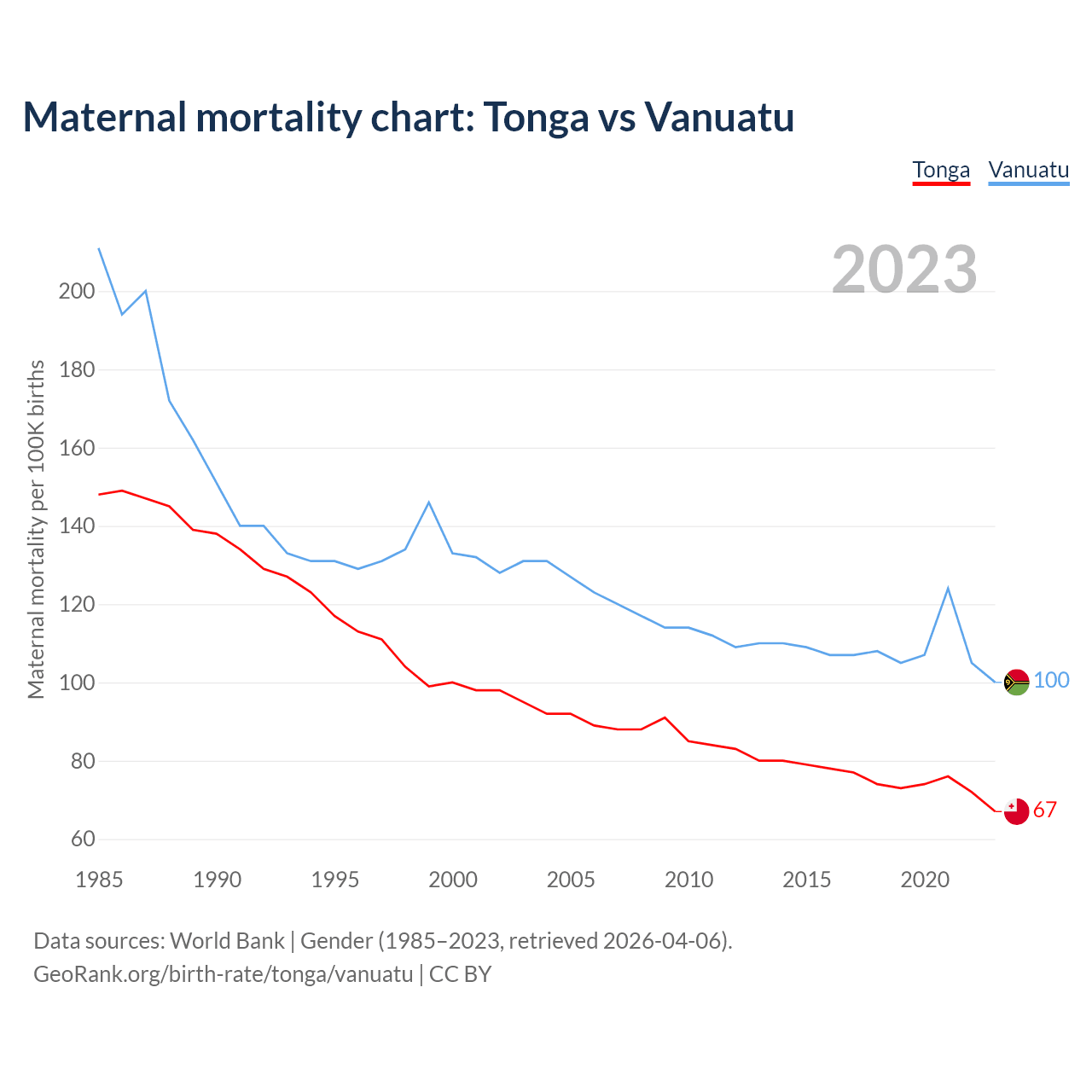 The maternal mortality rate, which is the probability of dying during childbirth or within 42 days of pregnancy termination, is 67 deaths per 100,000 live births in Tonga, compared to 100 deaths in Vanuatu.