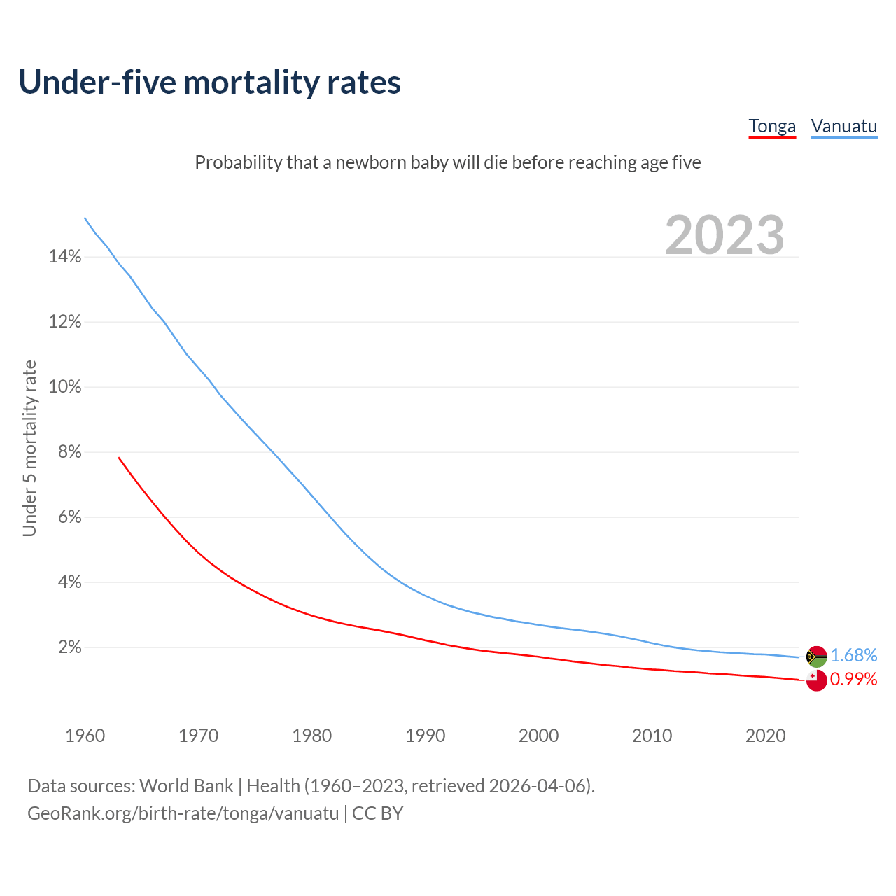 The chance that a newborn baby will die before reaching age five is 0.99% in Tonga and 1.68% in Vanuatu. Above is a chart with historical data on under-five mortality rates.