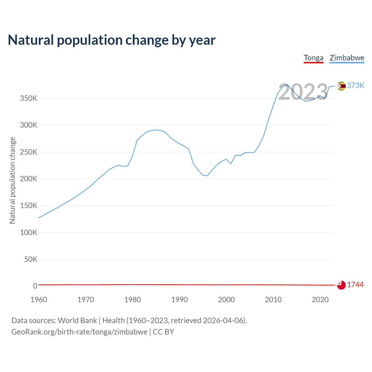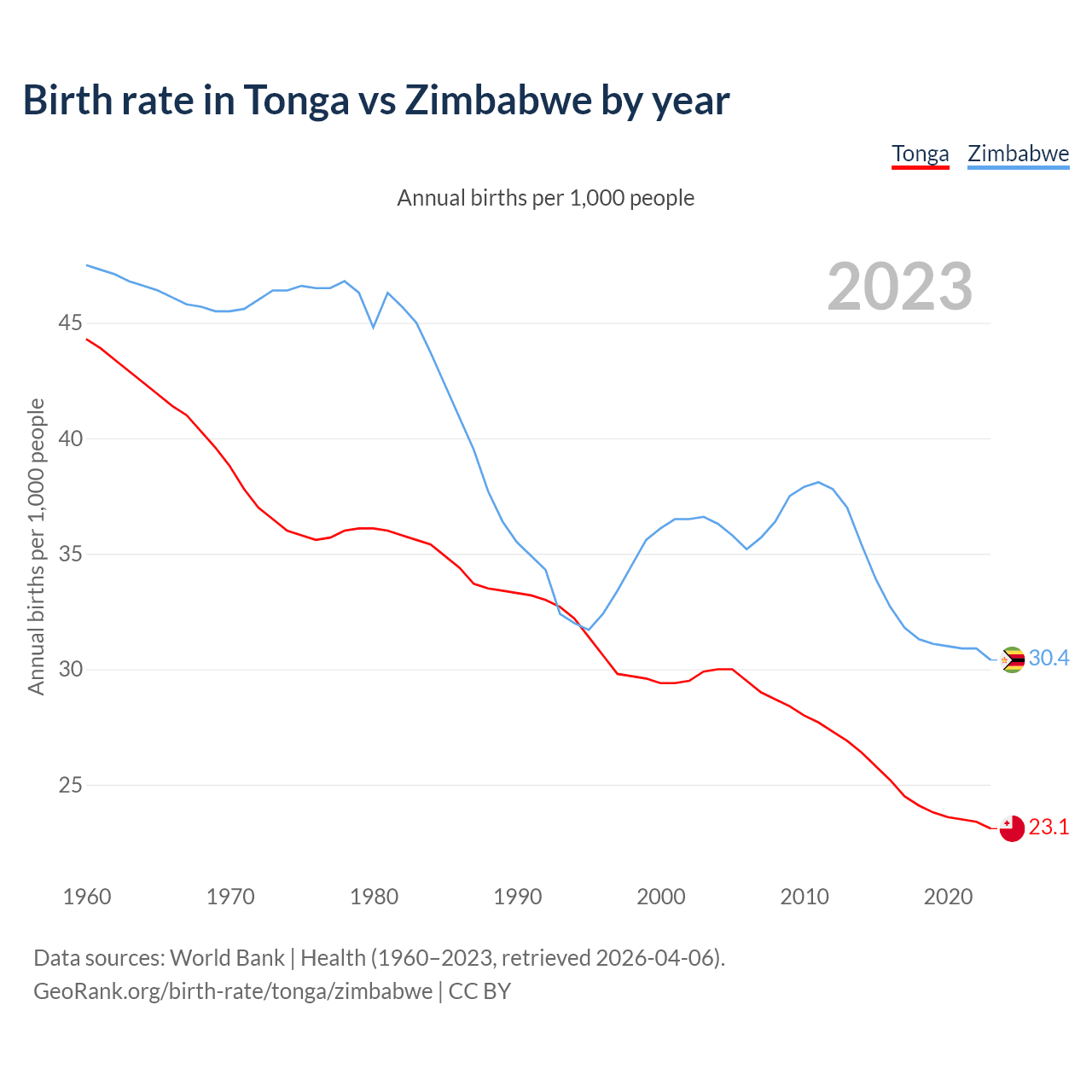 Tonga has an annual birth rate of 23.1 births per 1,000 people, compared to 30.4 for Zimbabwe. The average number of children a woman is expected to have during her lifetime — the fertility rate, is 3.13 in Tonga and 3.72 in Zimbabwe — 19% difference.