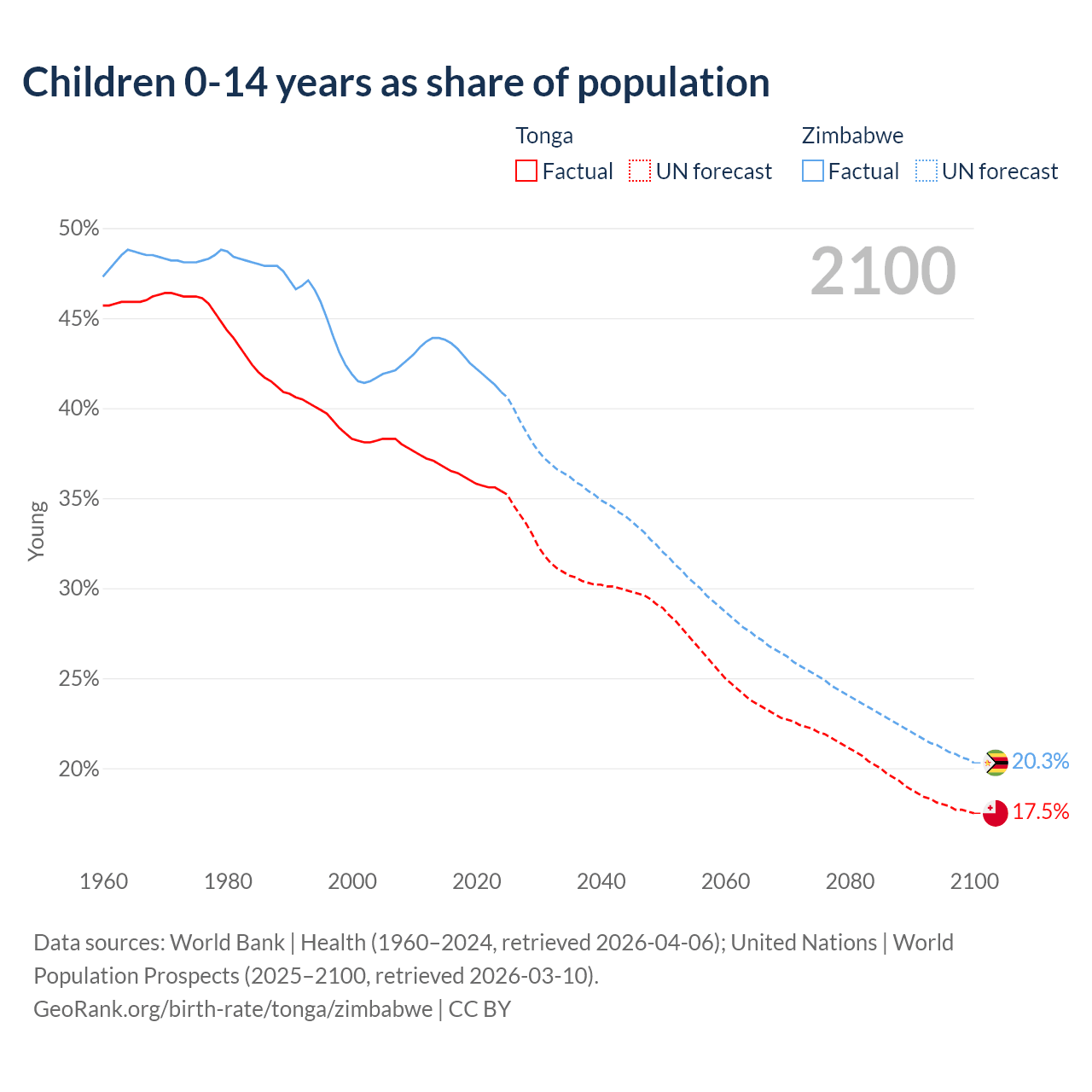 According to the latest available data on birth rates, the fertility rate in Tonga was 3.13 children per woman in 2023, compared to 3.72 in Zimbabwe in 2023. The replacement level is considered to be 2.1 children per woman.