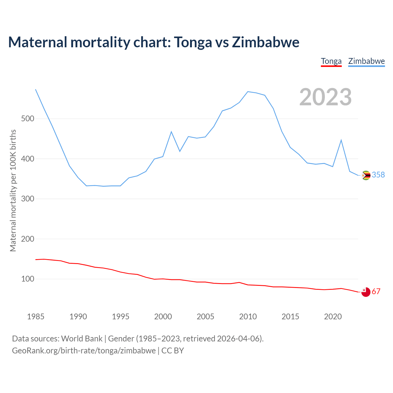 The maternal mortality rate, which is the probability of dying during childbirth or within 42 days of pregnancy termination, is 67 deaths per 100,000 live births in Tonga, compared to 358 deaths in Zimbabwe.