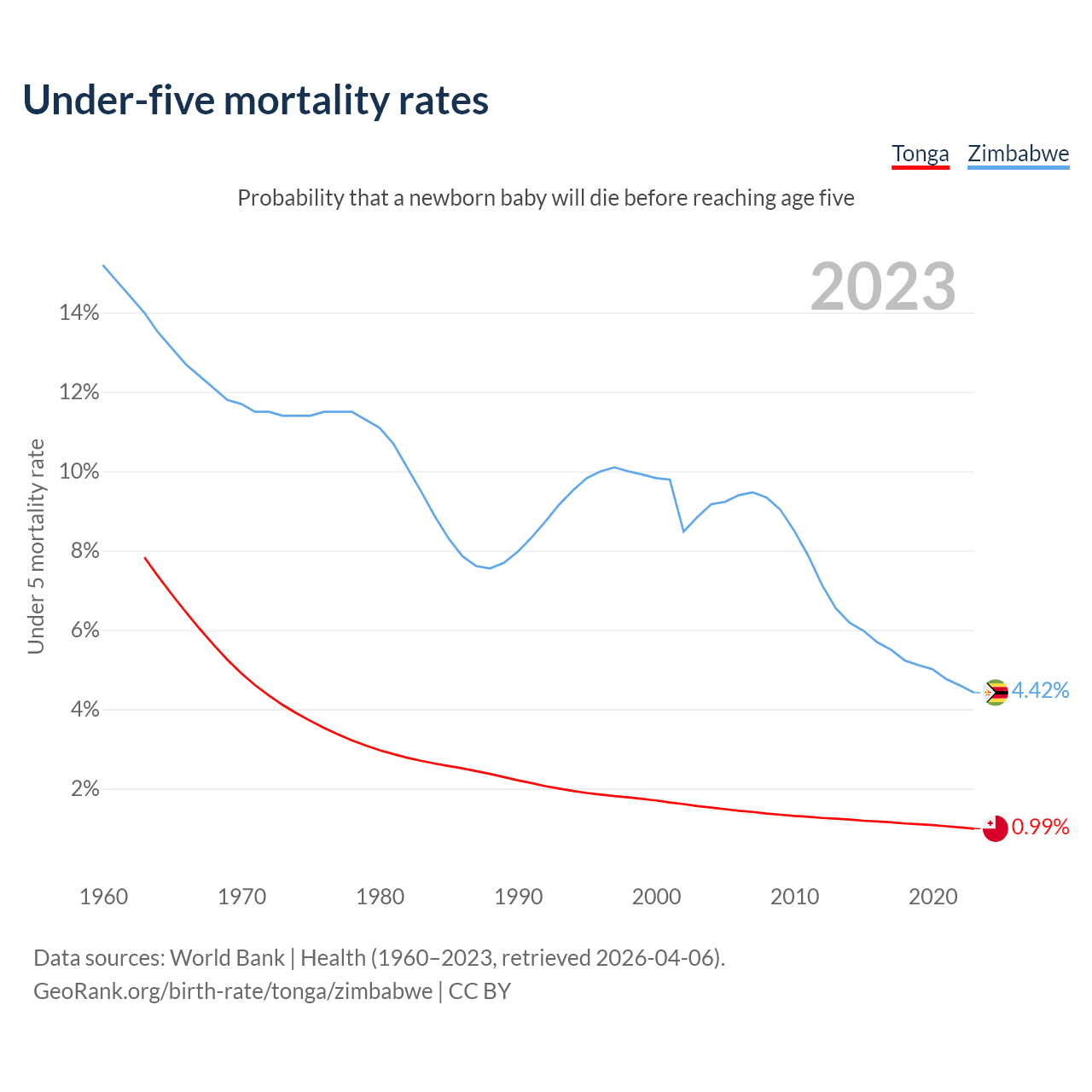 The chance that a newborn baby will die before reaching age five is 0.99% in Tonga and 4.42% in Zimbabwe. Above is a chart with historical data on under-five mortality rates.