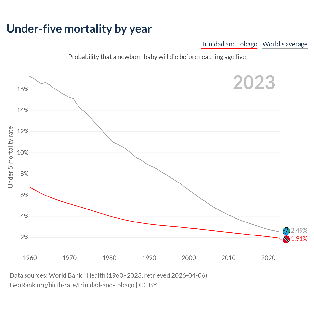 The under-5 mortality rate in Trinidad and Tobago was 19.1 deaths per 1,000 live births in 2023 — a 1.91% chance that a newborn baby will die before reaching age five. This is down from 28.8 deaths per 1,000 live births in 2000.