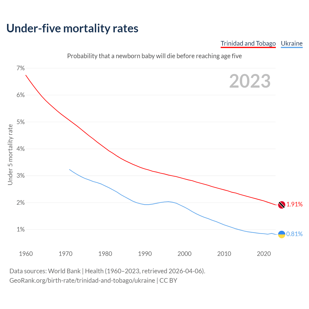 The chance that a newborn baby will die before reaching age five is 1.91% in Trinidad and Tobago and 0.81% in Ukraine. Above is a chart with historical data on under-five mortality rates.