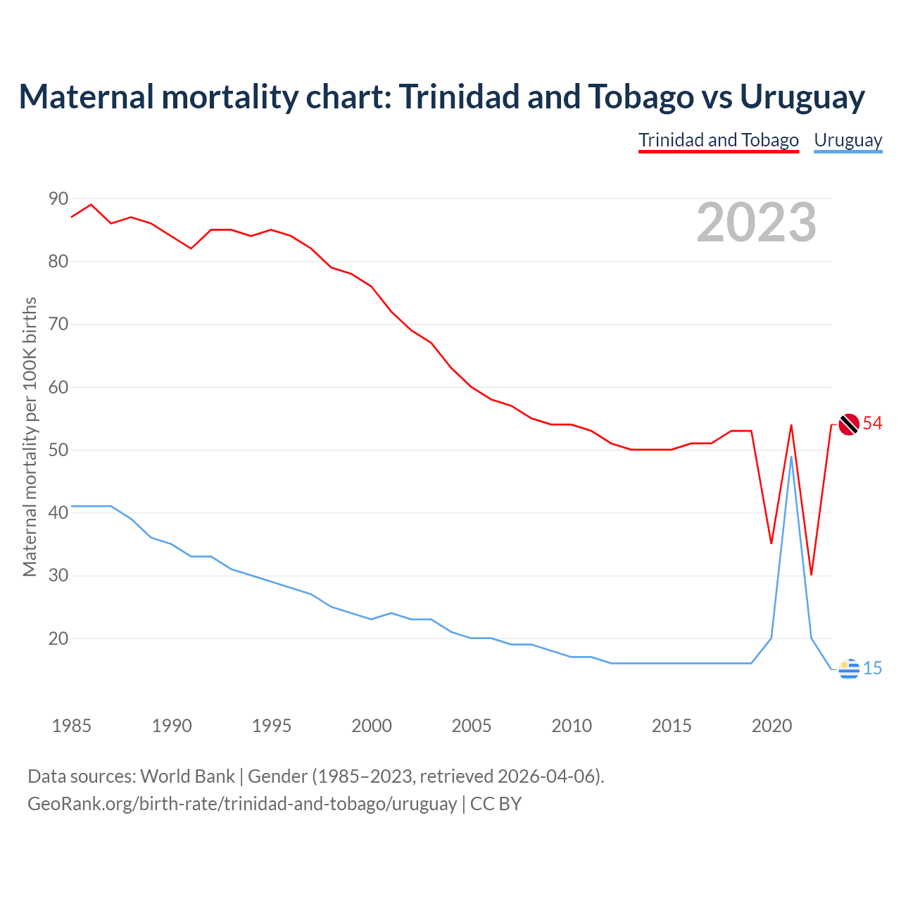 The maternal mortality rate, which is the probability of dying during childbirth or within 42 days of pregnancy termination, is 54 deaths per 100,000 live births in Trinidad and Tobago, compared to 15 deaths in Uruguay.