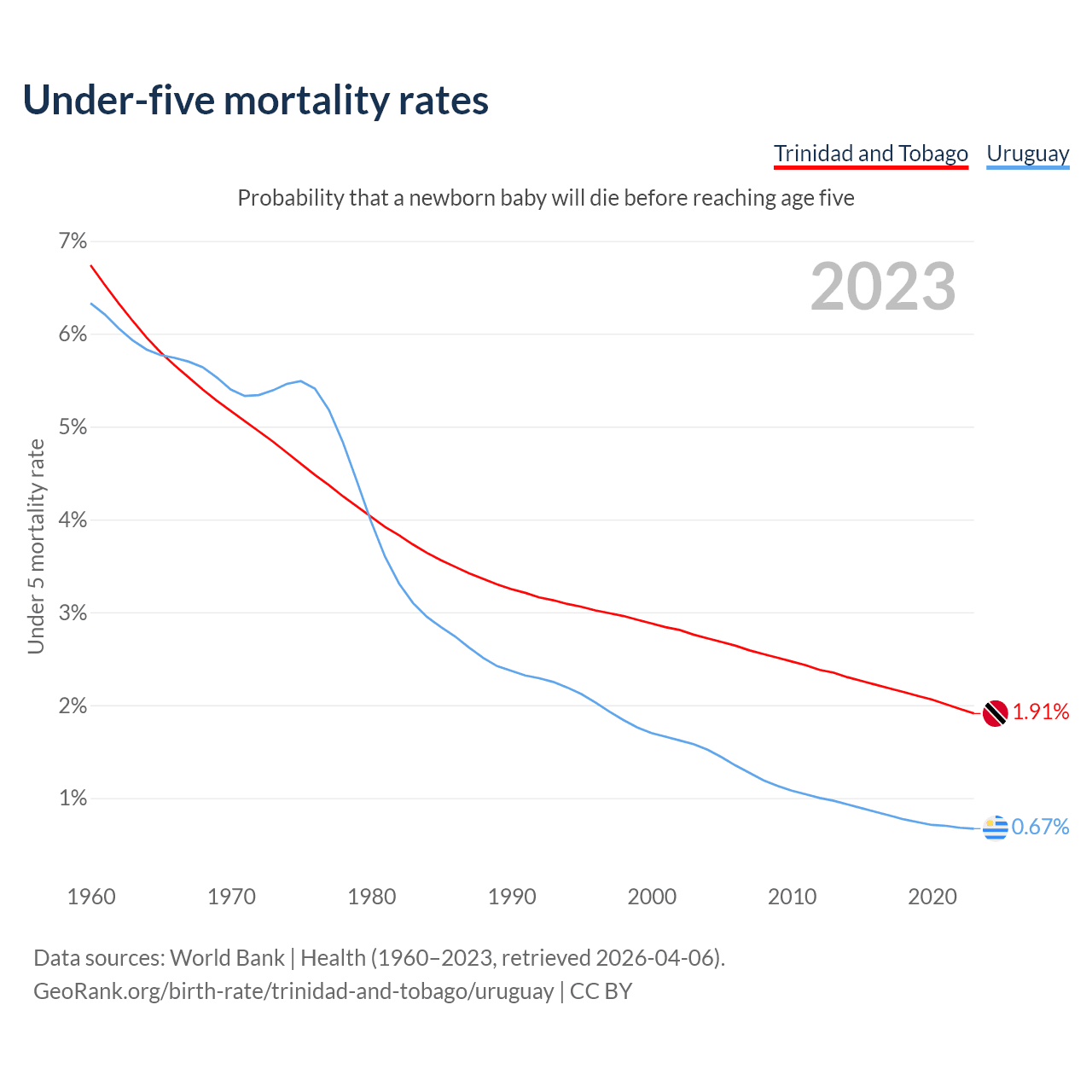 The chance that a newborn baby will die before reaching age five is 1.91% in Trinidad and Tobago and 0.67% in Uruguay. Above is a chart with historical data on under-five mortality rates.