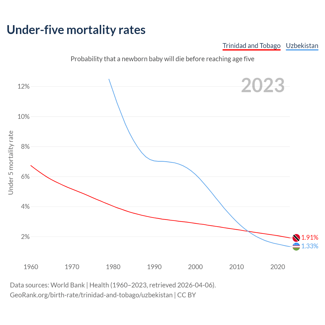The chance that a newborn baby will die before reaching age five is 1.91% in Trinidad and Tobago and 1.33% in Uzbekistan. Above is a chart with historical data on under-five mortality rates.