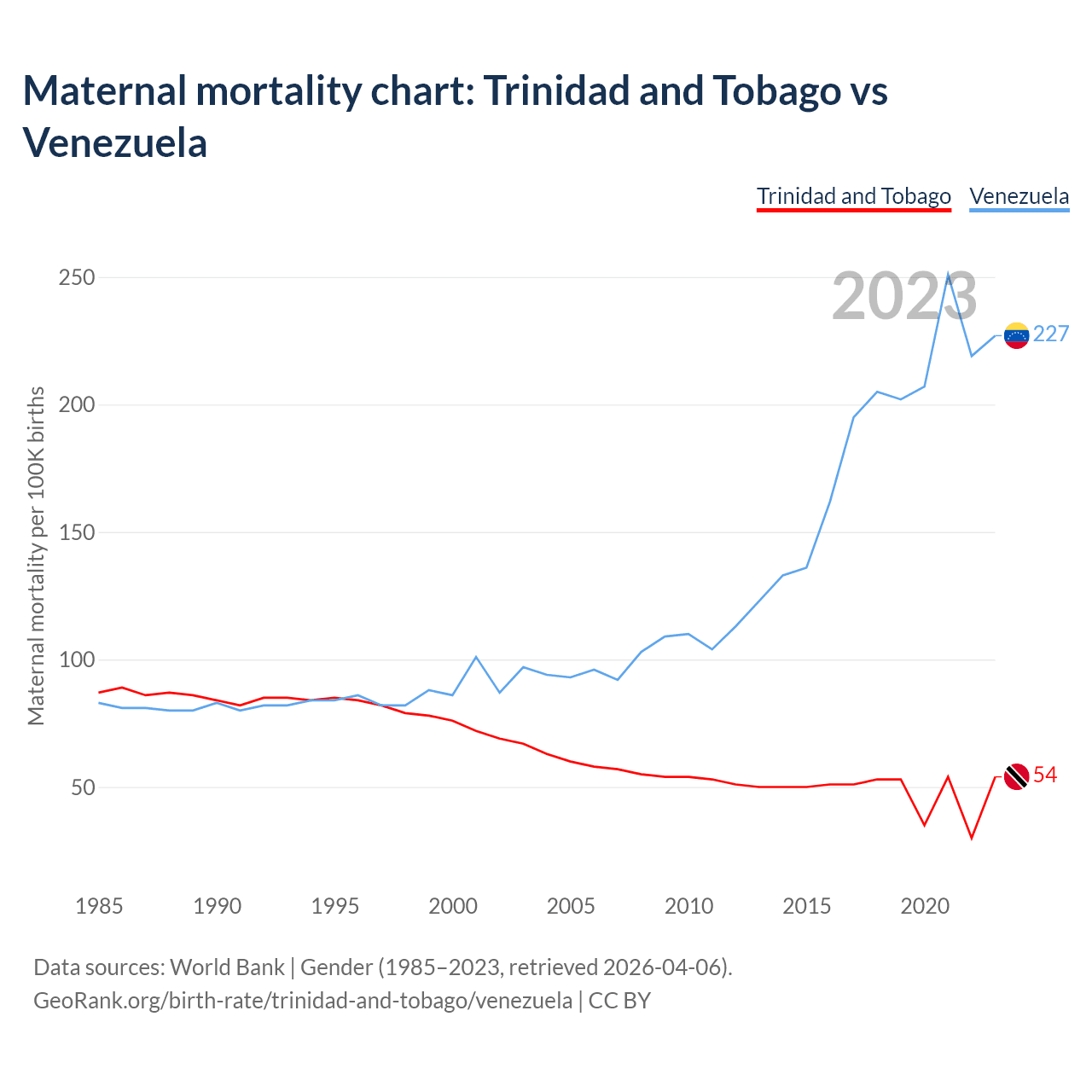The maternal mortality rate, which is the probability of dying during childbirth or within 42 days of pregnancy termination, is 54 deaths per 100,000 live births in Trinidad and Tobago, compared to 227 deaths in Venezuela.