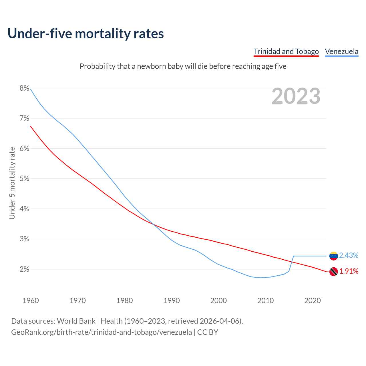 The chance that a newborn baby will die before reaching age five is 1.91% in Trinidad and Tobago and 2.43% in Venezuela. Above is a chart with historical data on under-five mortality rates.