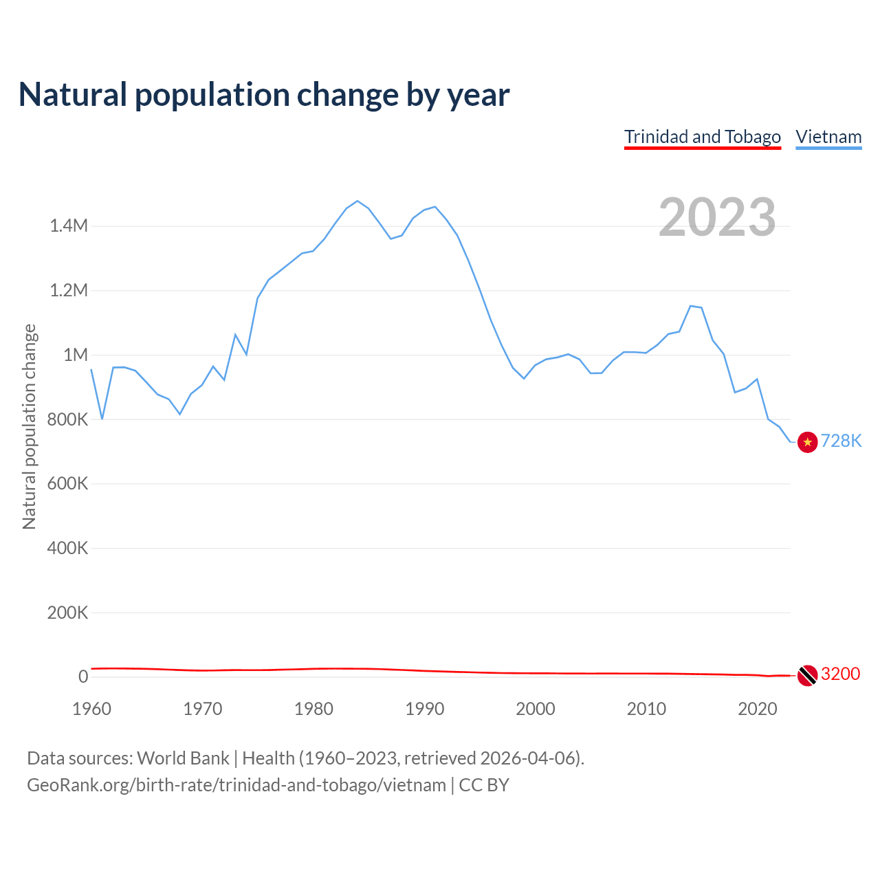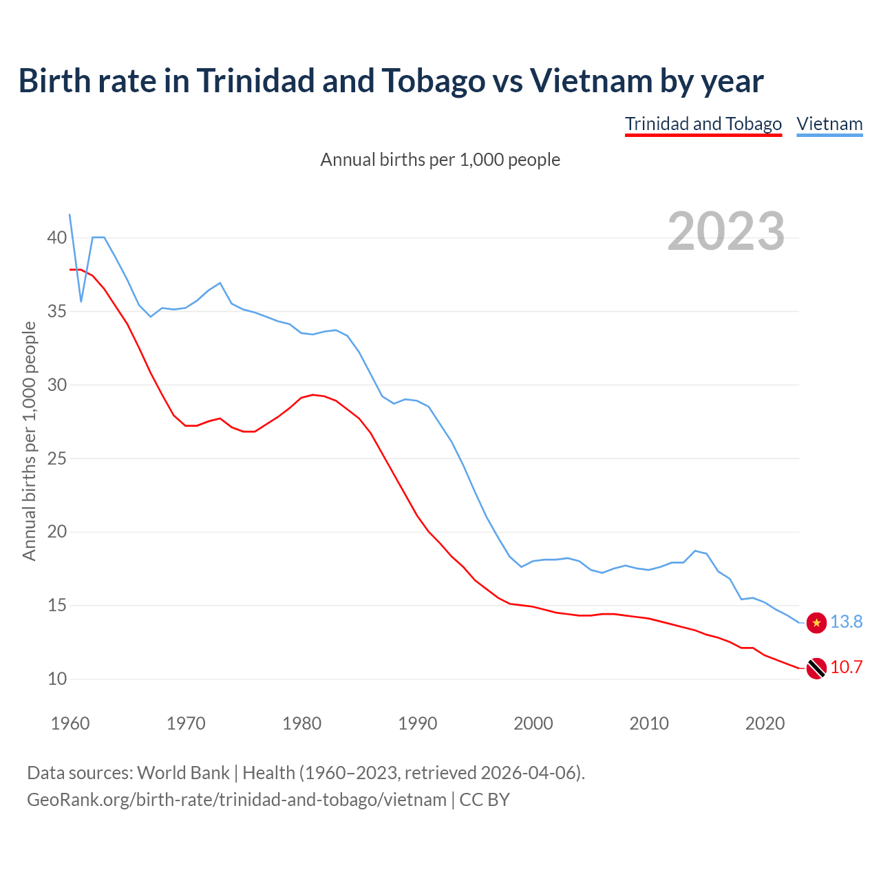 According to the latest available data on birth rates, the fertility rate in Trinidad and Tobago was 1.53 children per woman in 2023, compared to 1.91 in Vietnam in 2023. The replacement level is considered to be 2.1 children per woman.