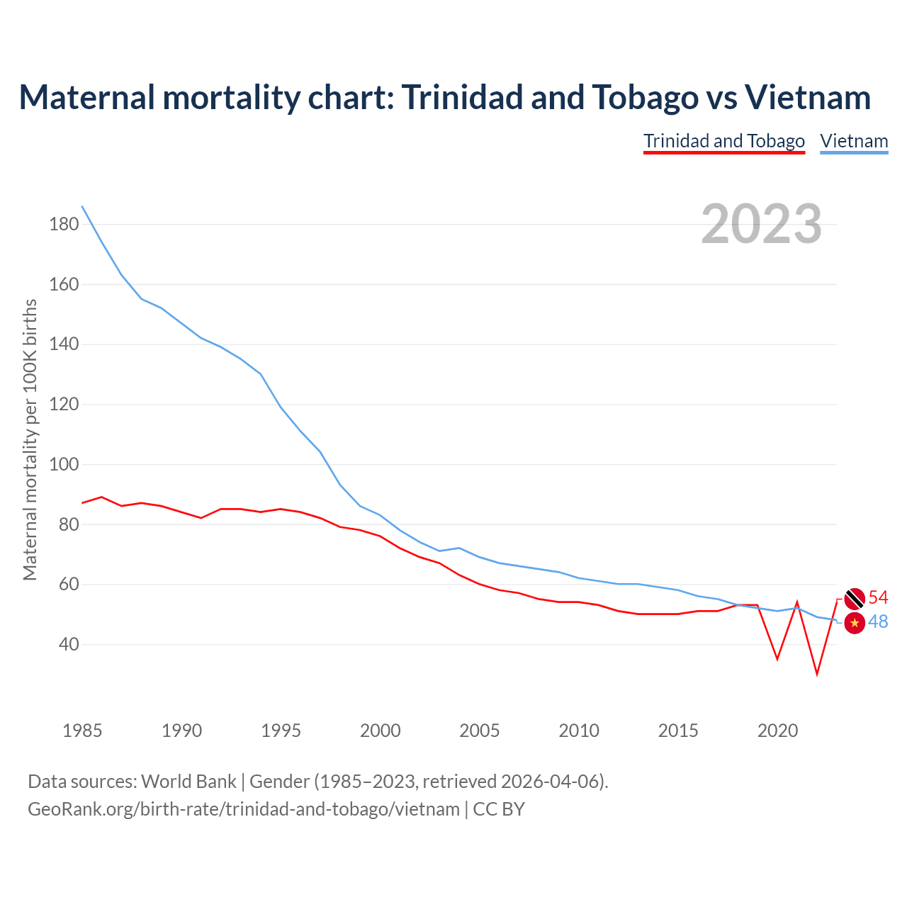 The maternal mortality rate, which is the probability of dying during childbirth or within 42 days of pregnancy termination, is 54 deaths per 100,000 live births in Trinidad and Tobago, compared to 48 deaths in Vietnam.