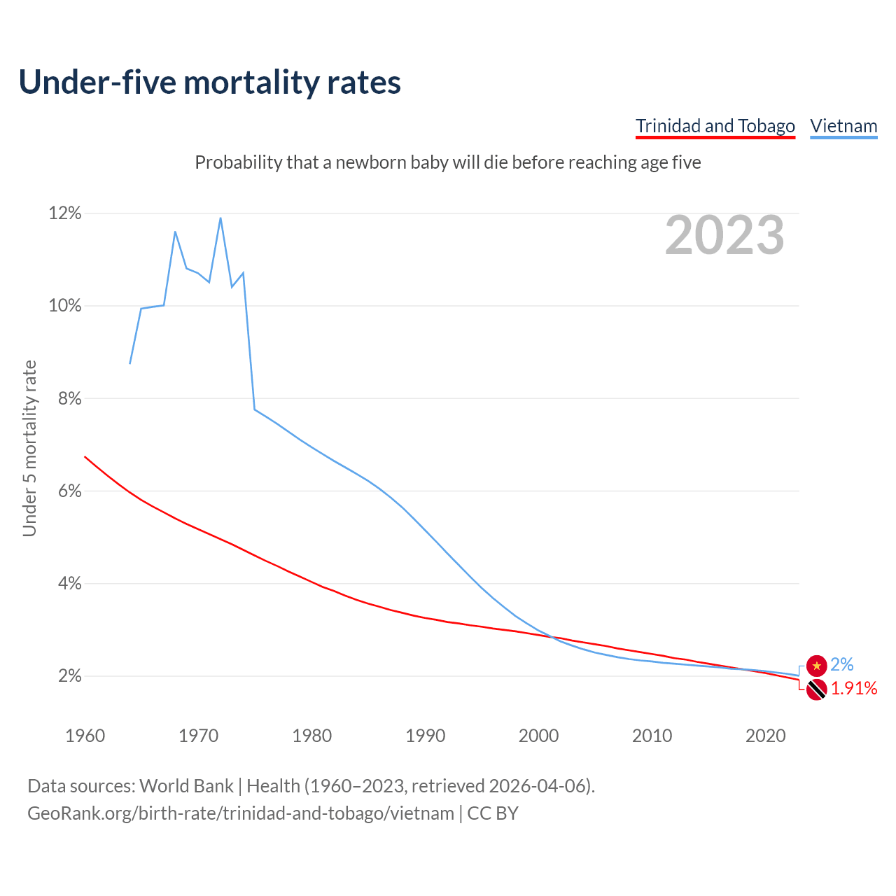 The chance that a newborn baby will die before reaching age five is 1.91% in Trinidad and Tobago and 2% in Vietnam. Above is a chart with historical data on under-five mortality rates.