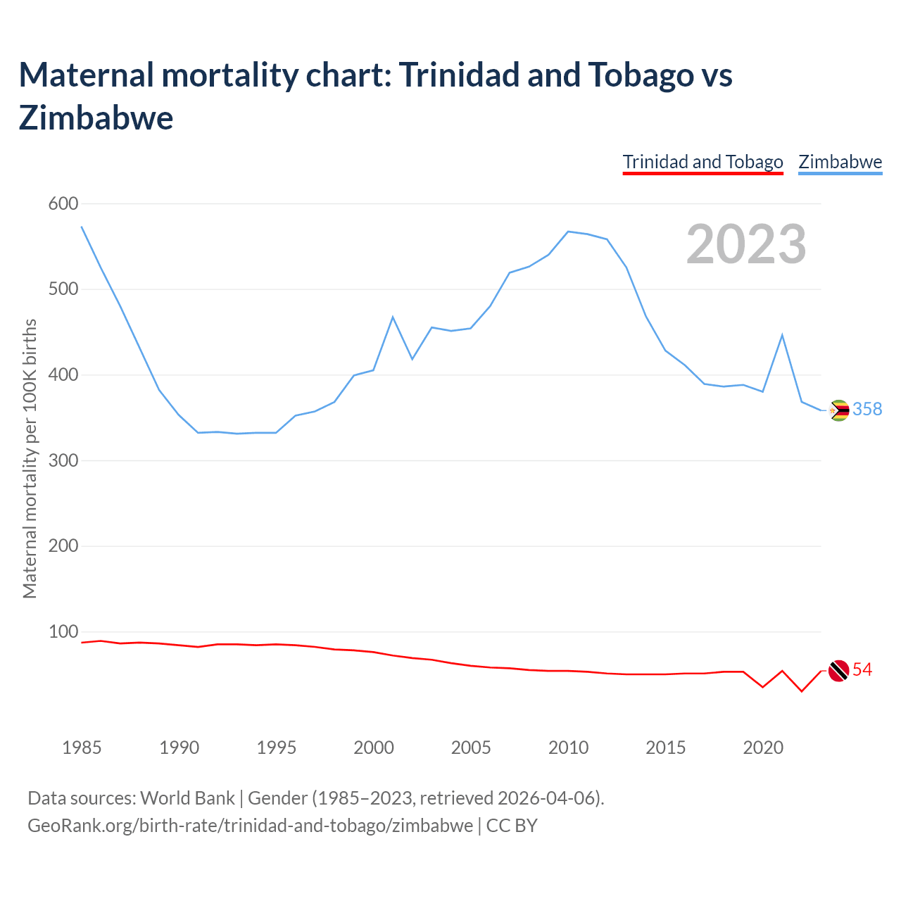 The maternal mortality rate, which is the probability of dying during childbirth or within 42 days of pregnancy termination, is 54 deaths per 100,000 live births in Trinidad and Tobago, compared to 358 deaths in Zimbabwe.