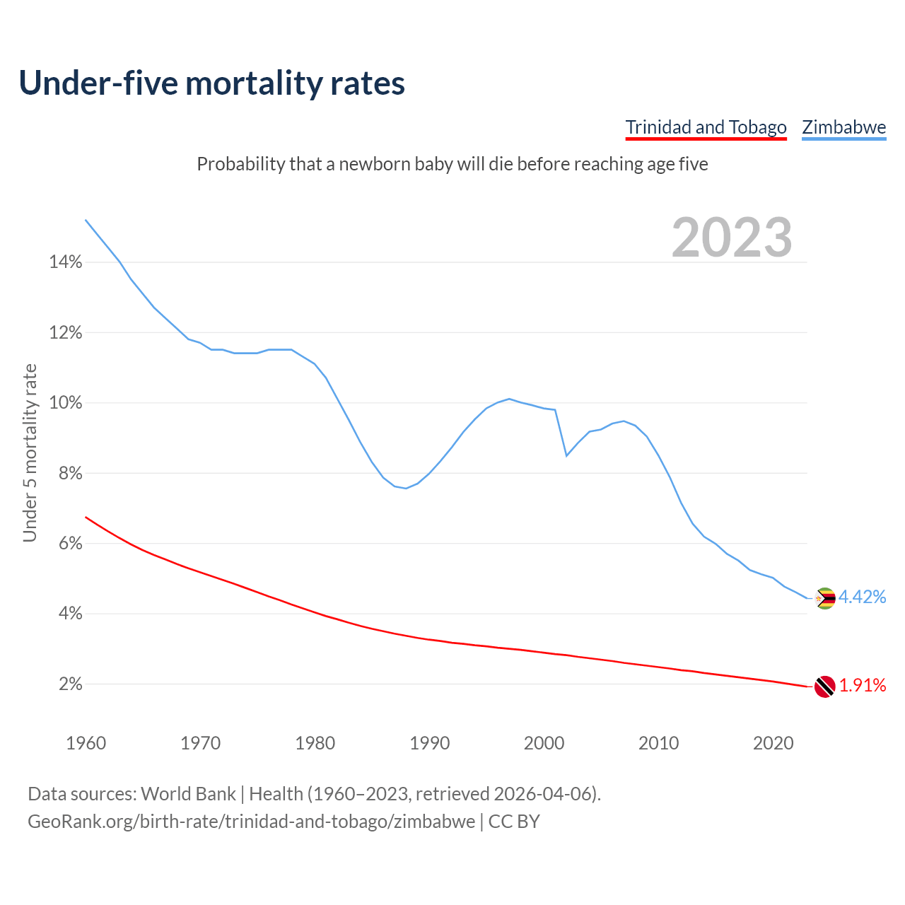 The chance that a newborn baby will die before reaching age five is 1.91% in Trinidad and Tobago and 4.42% in Zimbabwe. Above is a chart with historical data on under-five mortality rates.