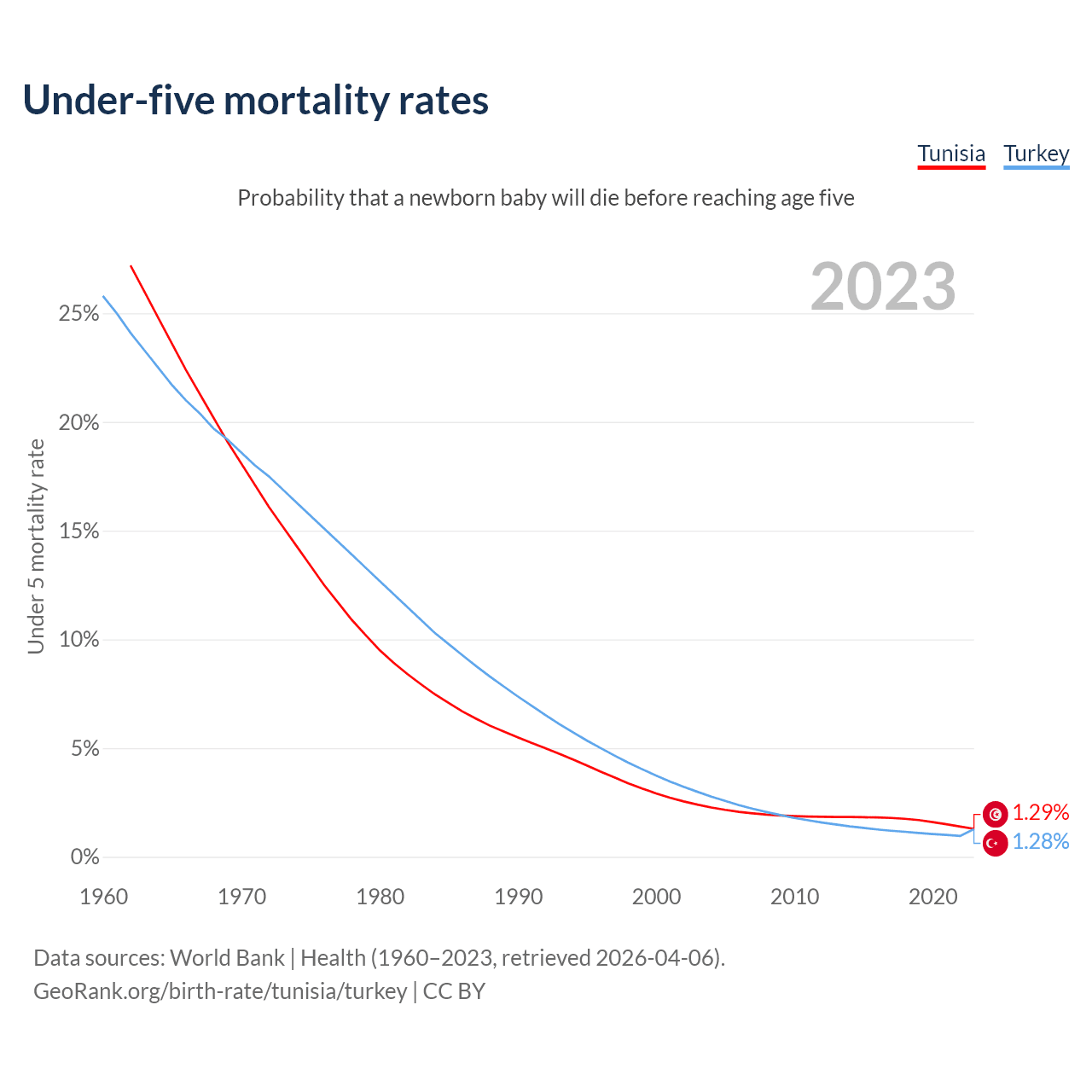The chance that a newborn baby will die before reaching age five is 1.29% in Tunisia and 1.28% in Turkey. Above is a chart with historical data on under-five mortality rates.