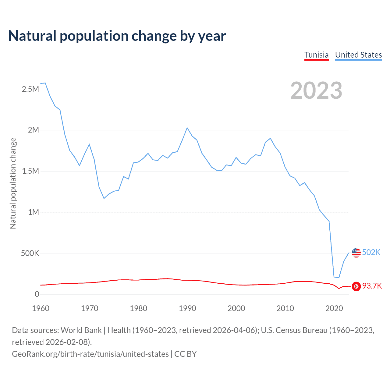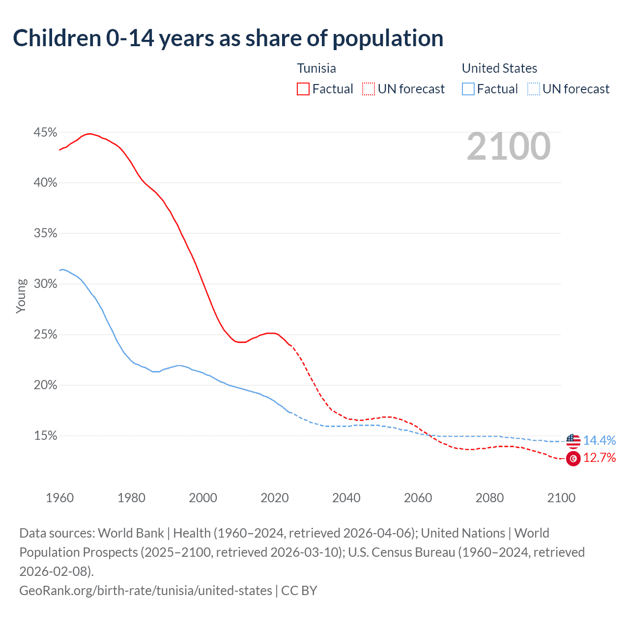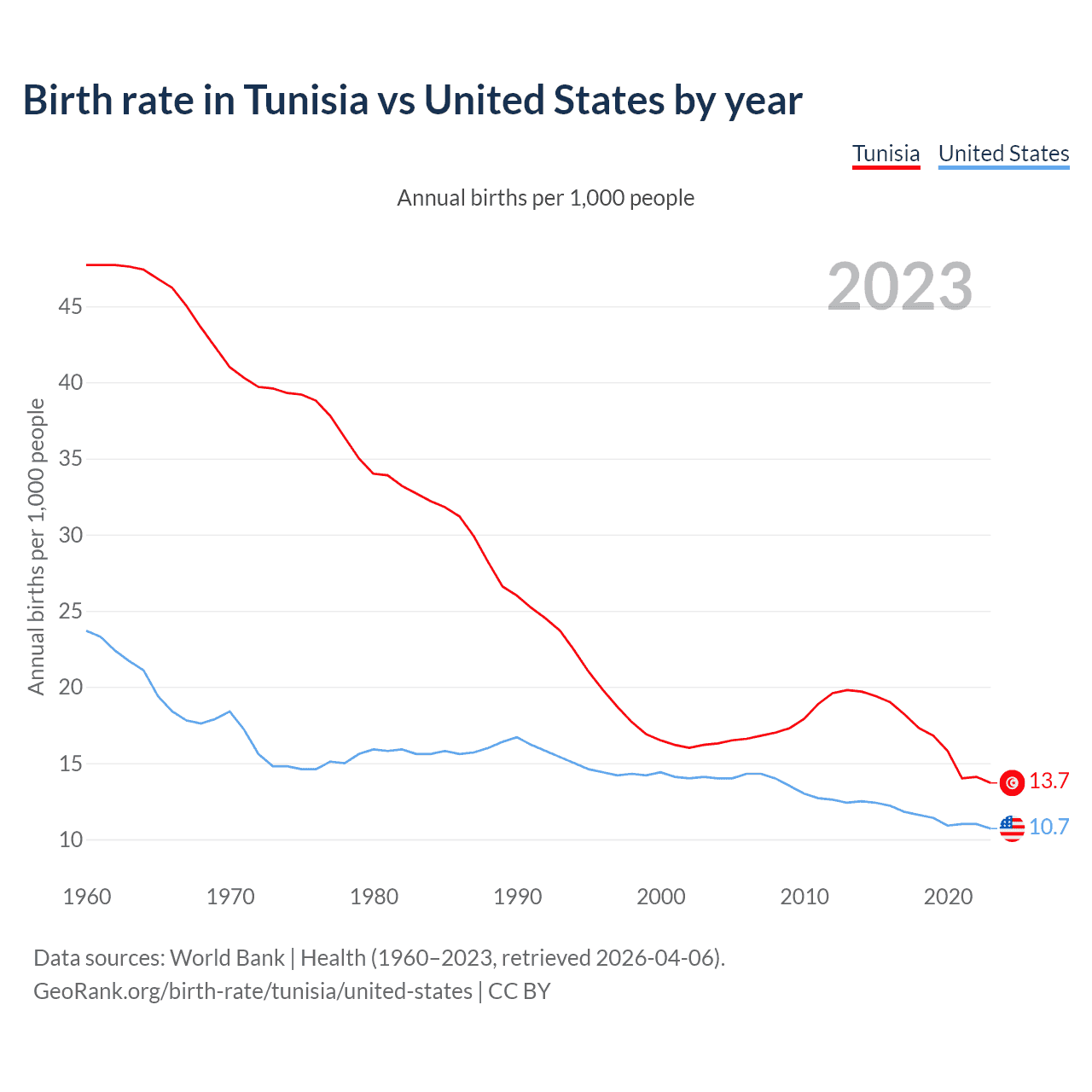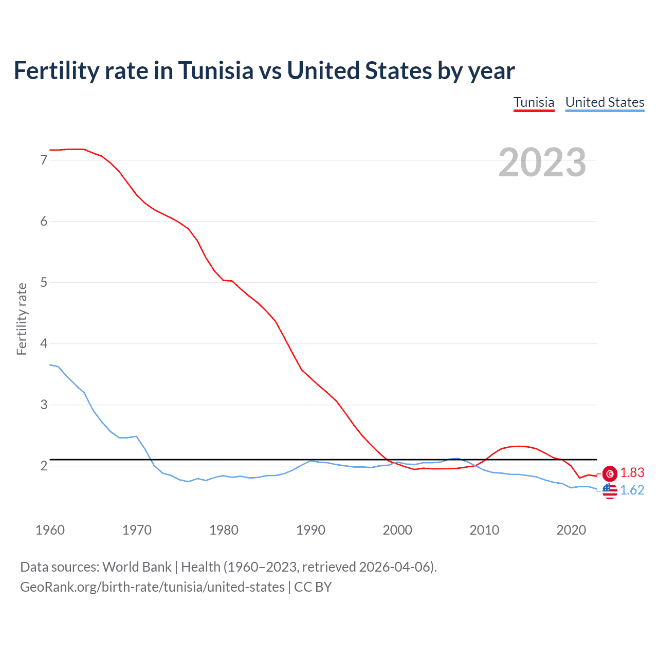 According to the latest available data on birth rates, the fertility rate in Tunisia was 1.83 children per woman in 2023, compared to 1.62 in the United States in 2023. The replacement level is considered to be 2.1 children per woman.