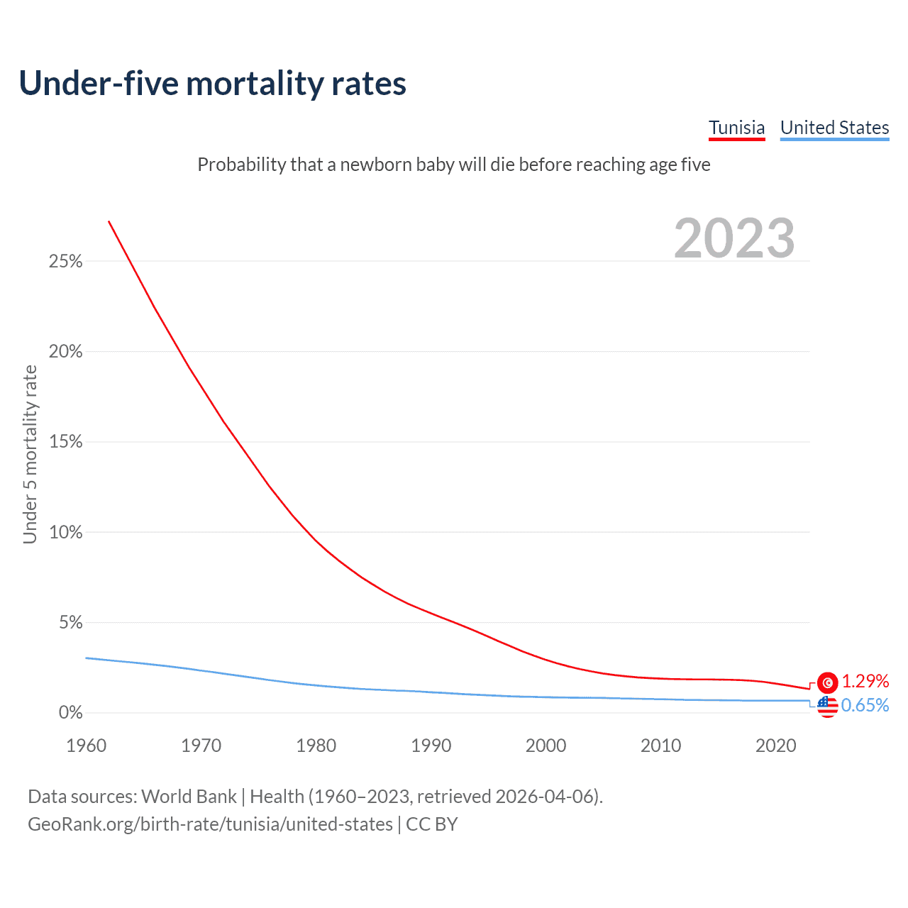 The chance that a newborn baby will die before reaching age five is 1.29% in Tunisia and 0.65% in the United States. Above is a chart with historical data on under-five mortality rates.