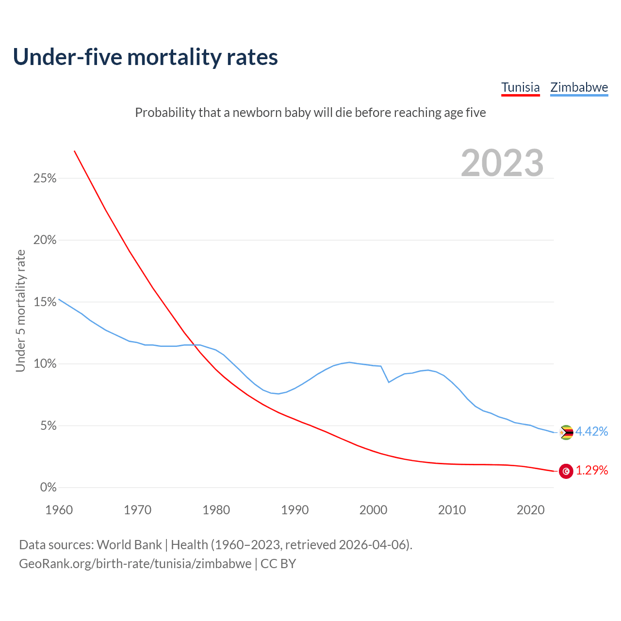 The chance that a newborn baby will die before reaching age five is 1.29% in Tunisia and 4.42% in Zimbabwe. Above is a chart with historical data on under-five mortality rates.