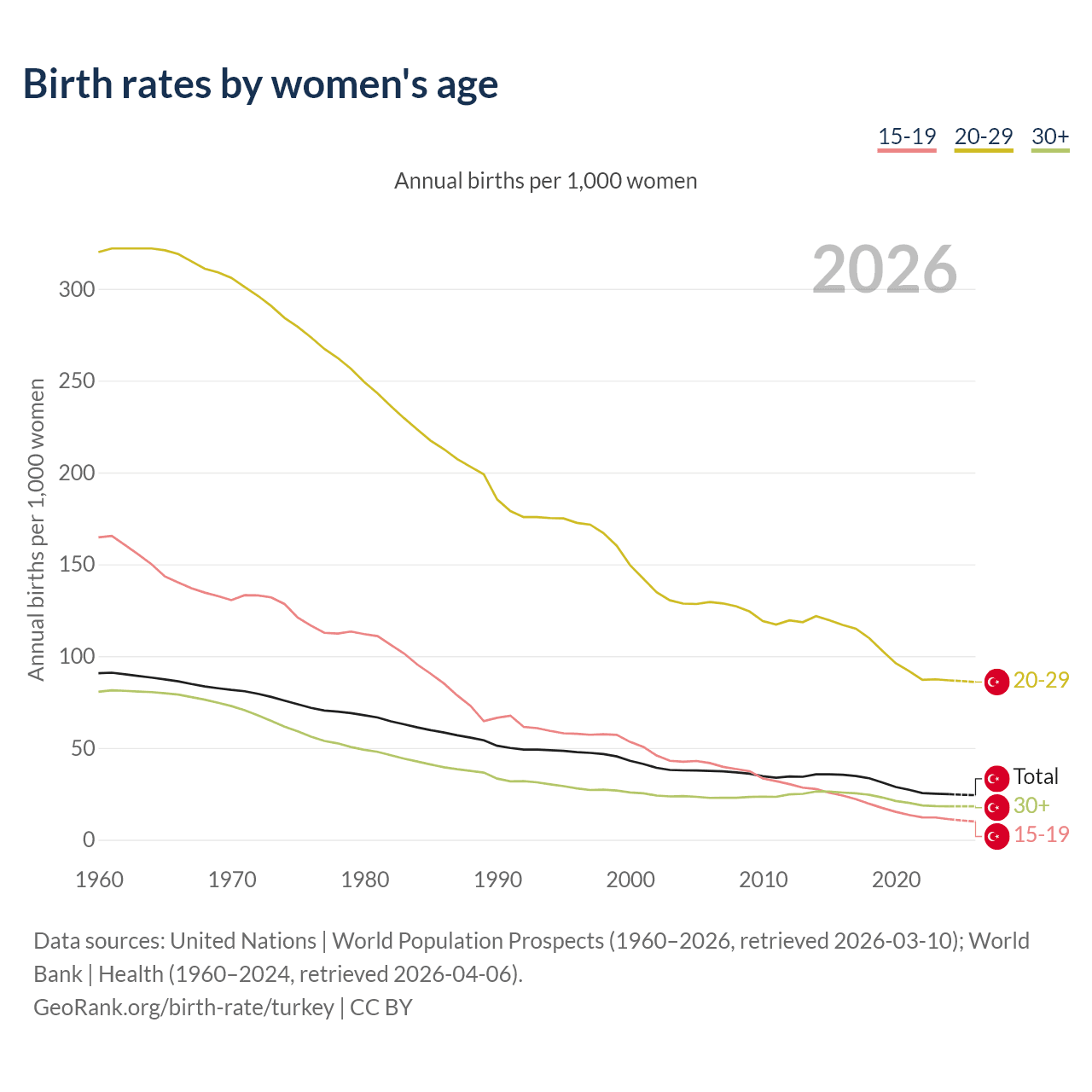 According to the latest birth rate data available, the fertility rate in Turkey was 1.51 in 2023 and has been below the replacement level of 2.1 children per woman since 2017. In 1993, the fertility rate was 2.92 — a 48.2% decline in 30 years.