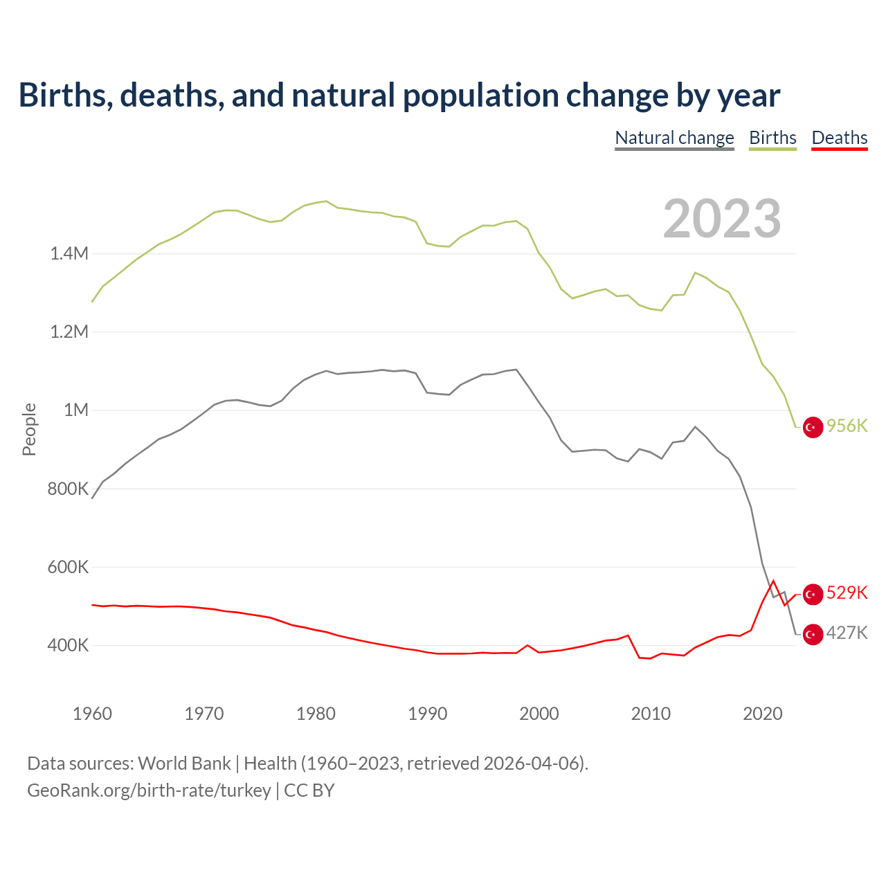 The under-5 mortality rate in Turkey was 12.8 deaths per 1,000 live births in 2023 — a 1.28% chance that a newborn baby will die before reaching age five. This is down from 37.4 deaths per 1,000 live births in 2000.