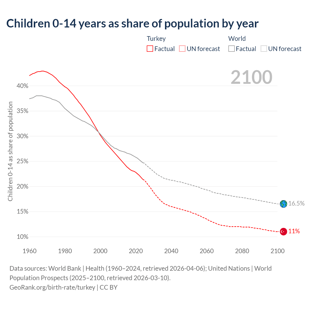 Turkey has a birth rate of 11.2 (annual births per 1,000 people) and a fertility rate of 1.51 (the average number of children a woman is expected to have over her lifetime based on current age-specific birth rates).