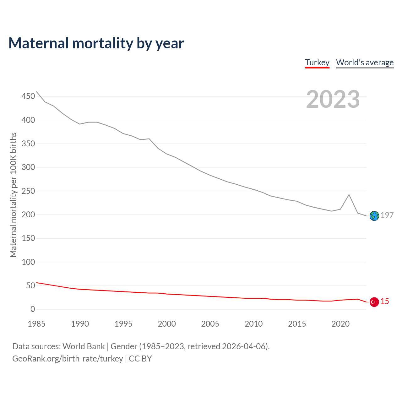 The maternal mortality rate in Turkey was 15 deaths per 100,000 live births in 2023 — a 0.02% chance of dying during childbirth or within 42 days of pregnancy termination. This is a 53.1% decrease compared to the year 2000.